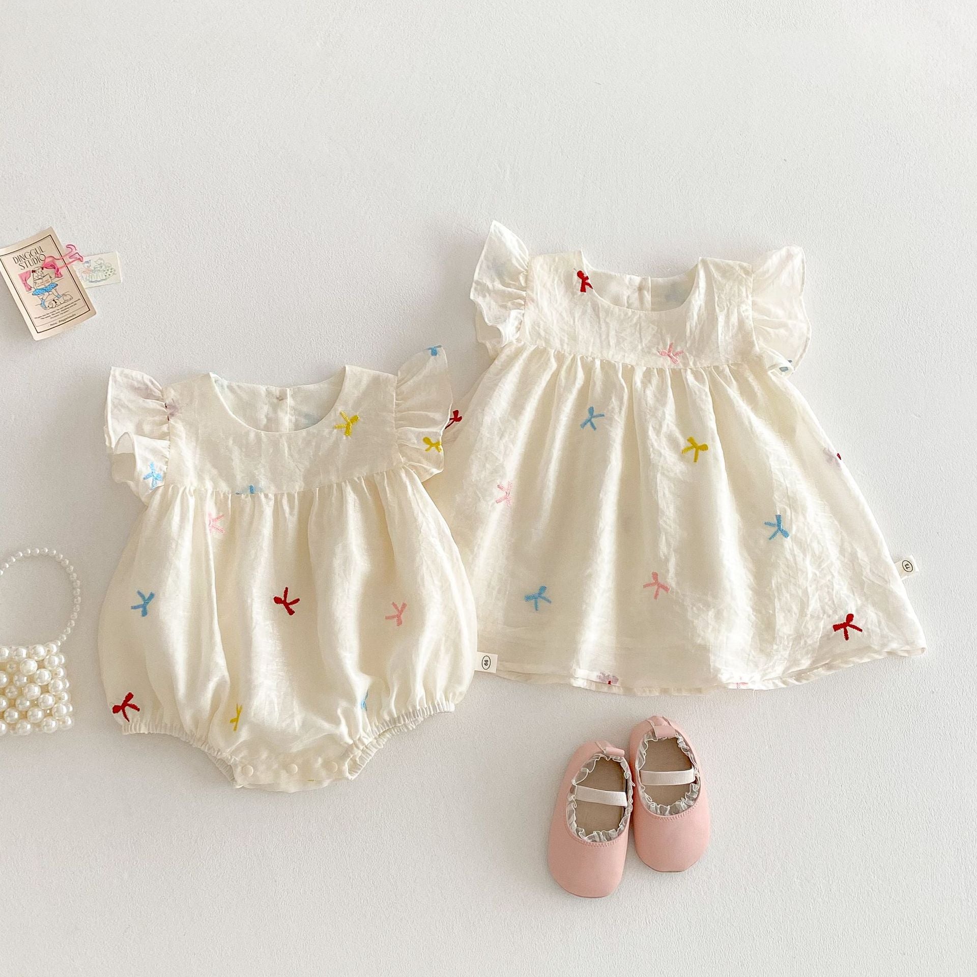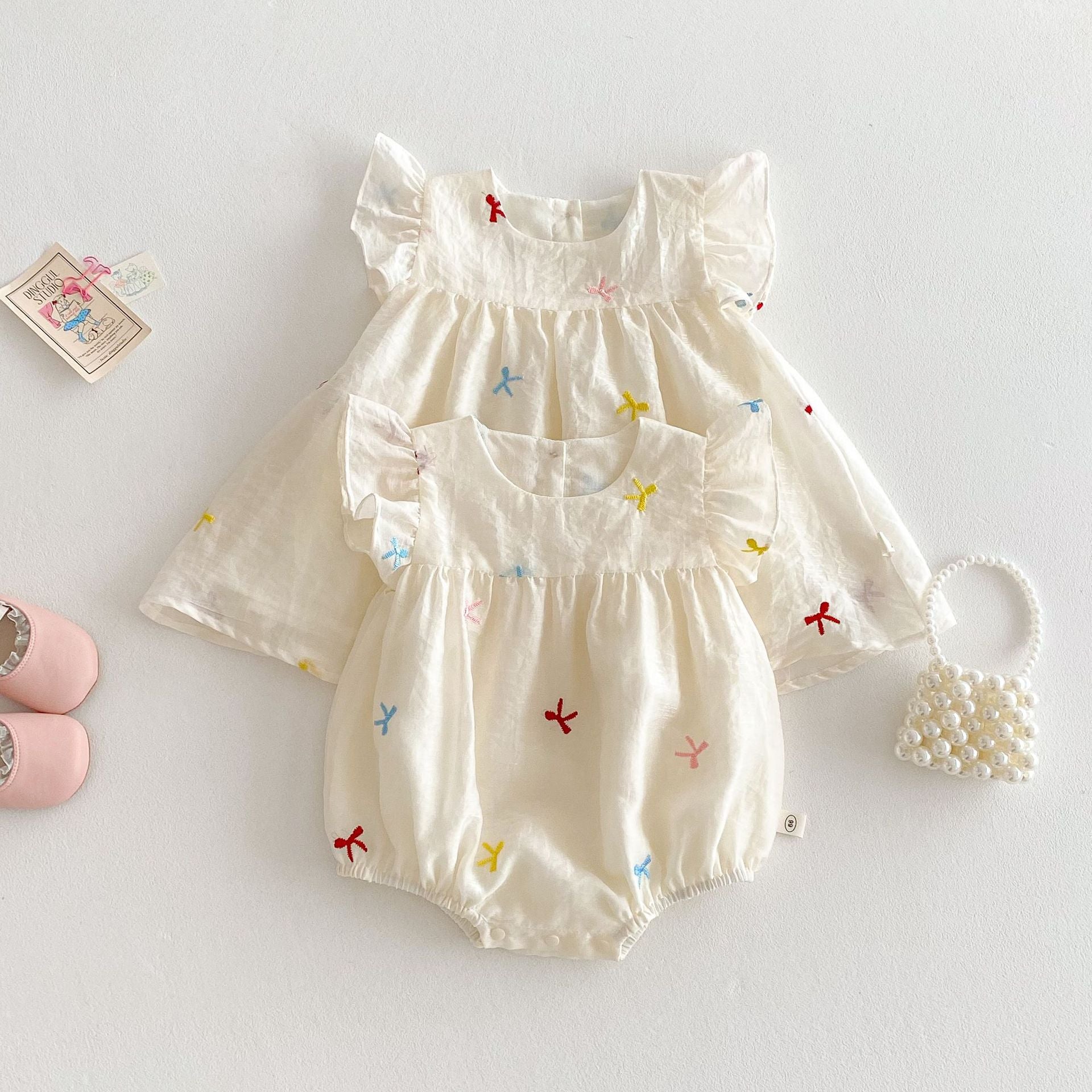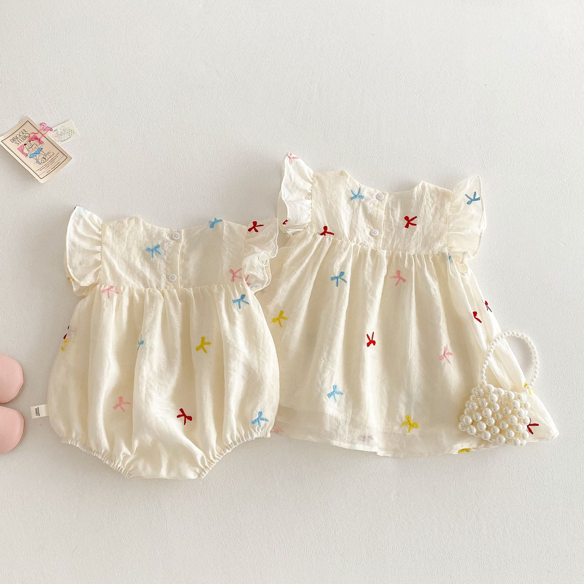 【姉妹服】夏新作 フリル蝶結び柄ロンパース、ワンピースSK061603