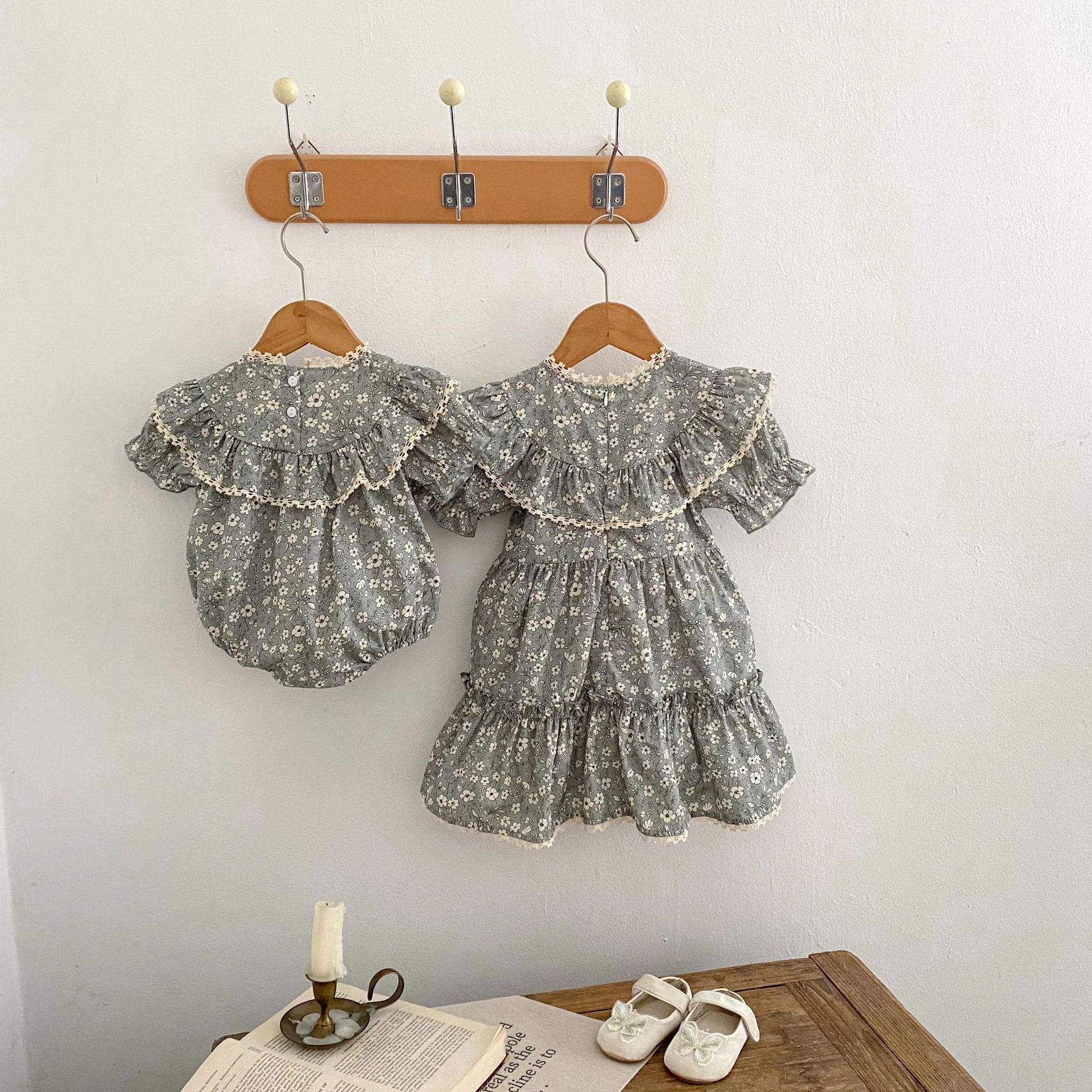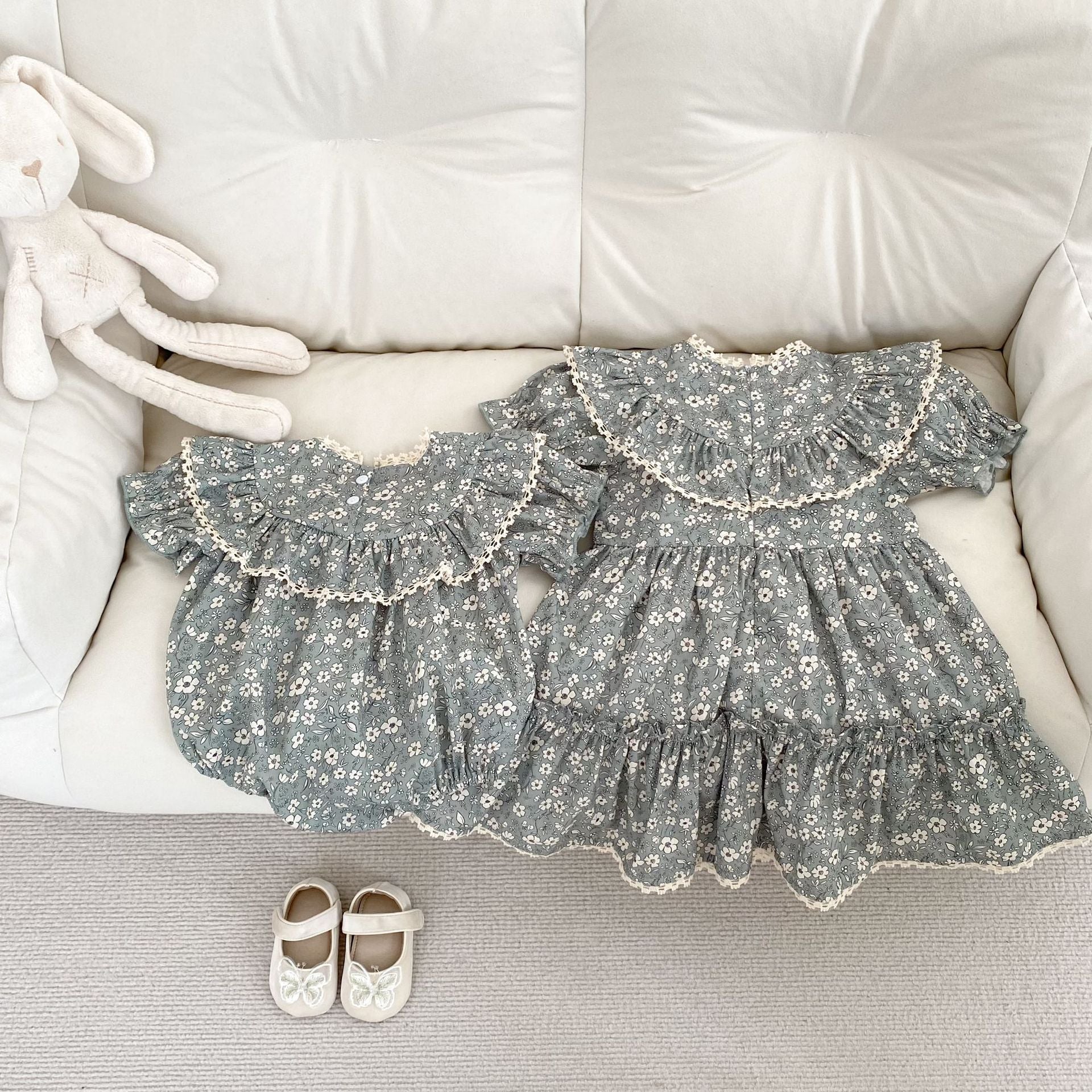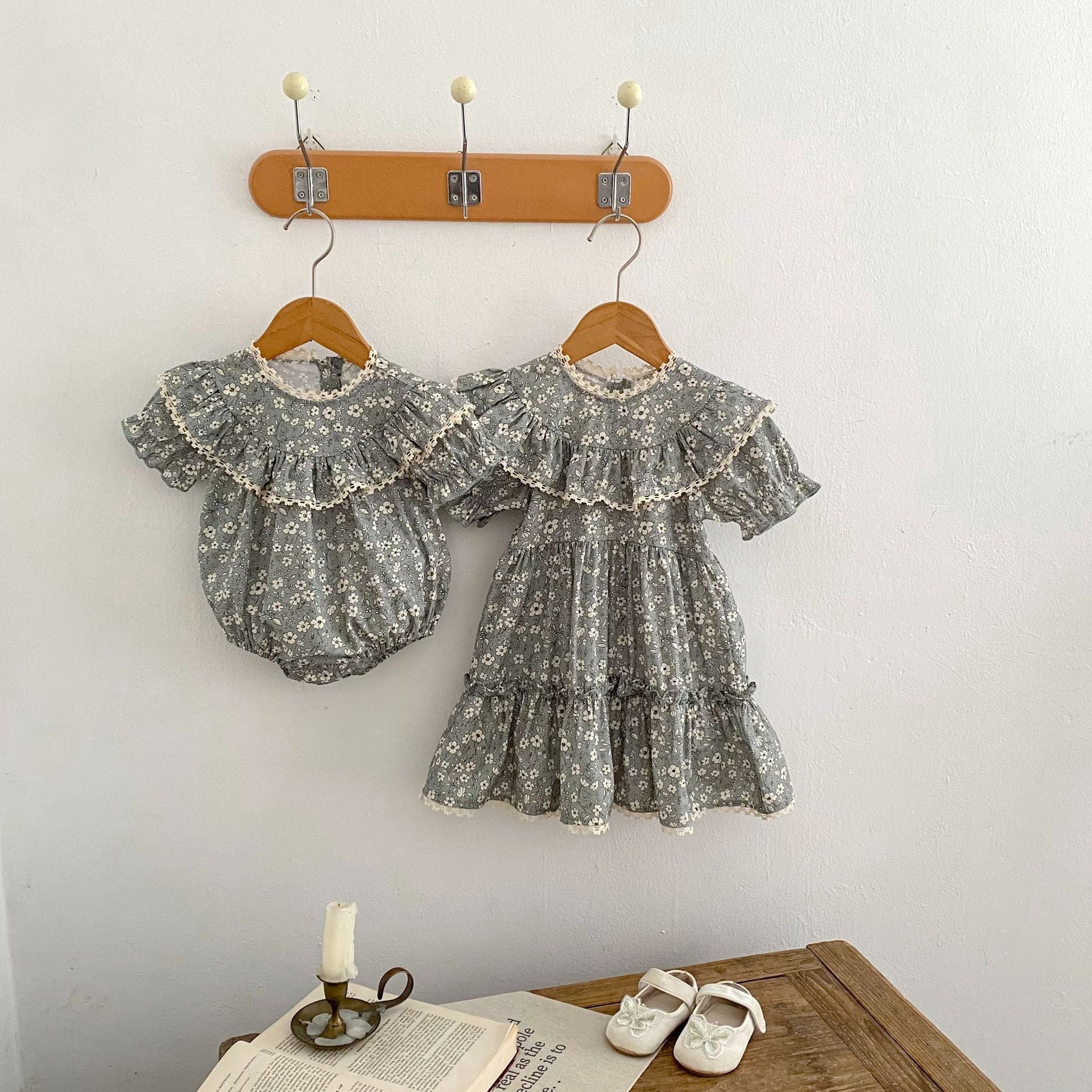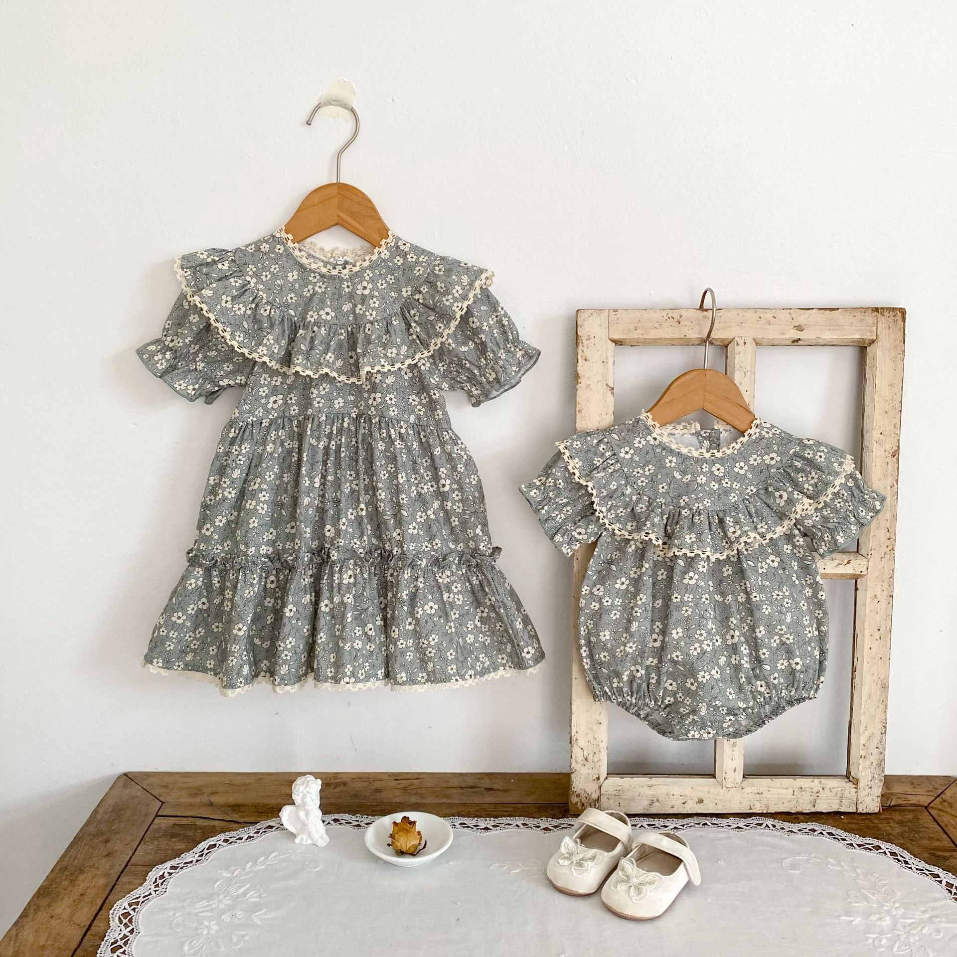 【姉妹服】夏新作 花柄グレーロンパース/ワンピースSK062317