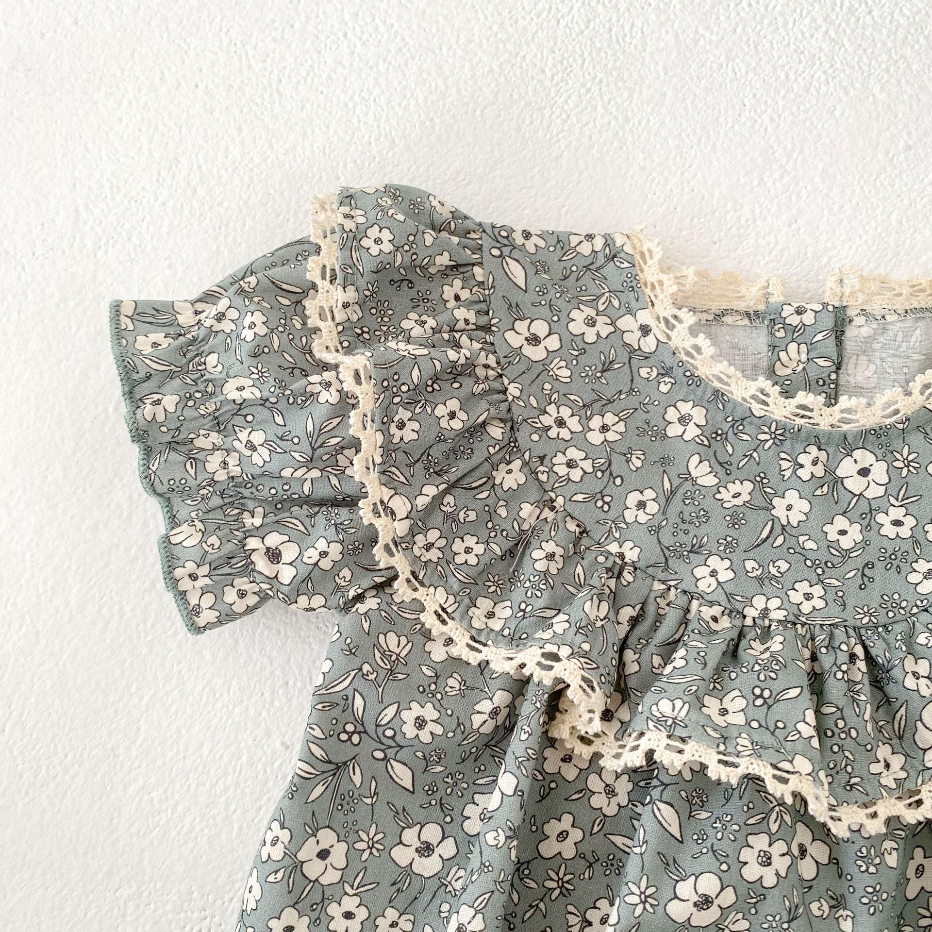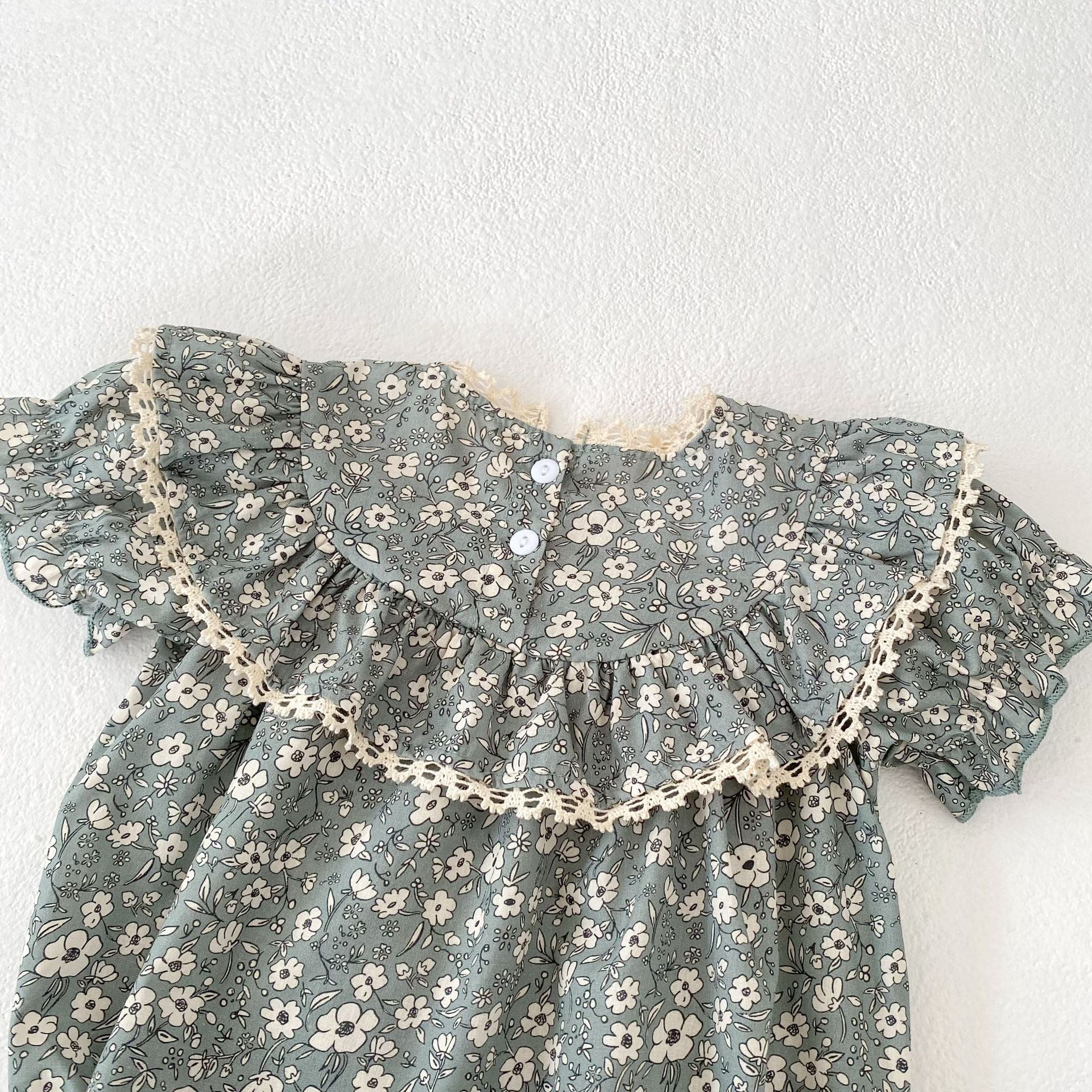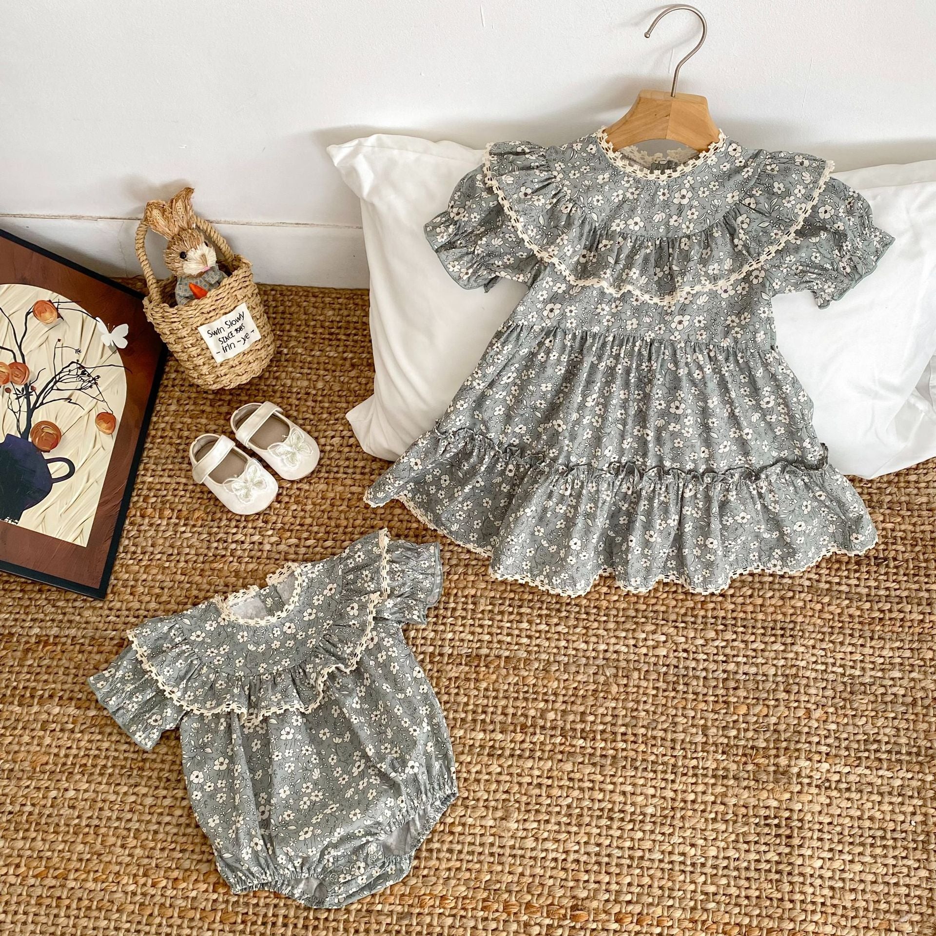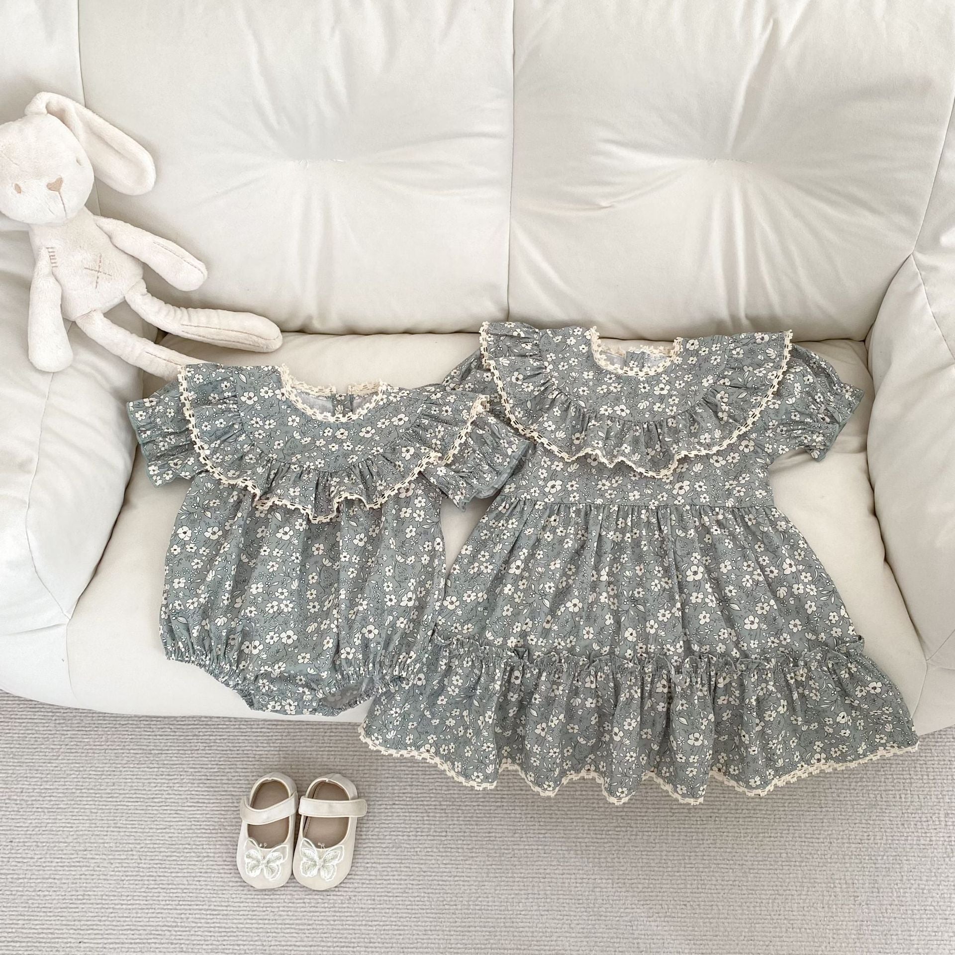 【姉妹服】夏新作 花柄グレーロンパース/ワンピースSK062317