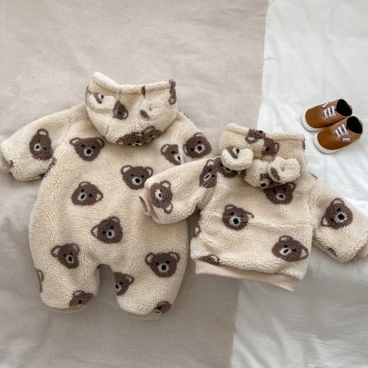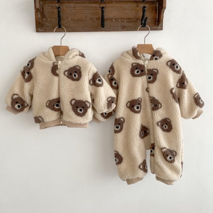 【BABY】もこもこ帽子付きクマ柄アウター、ロンパースSK11365