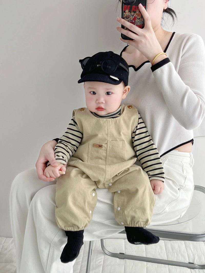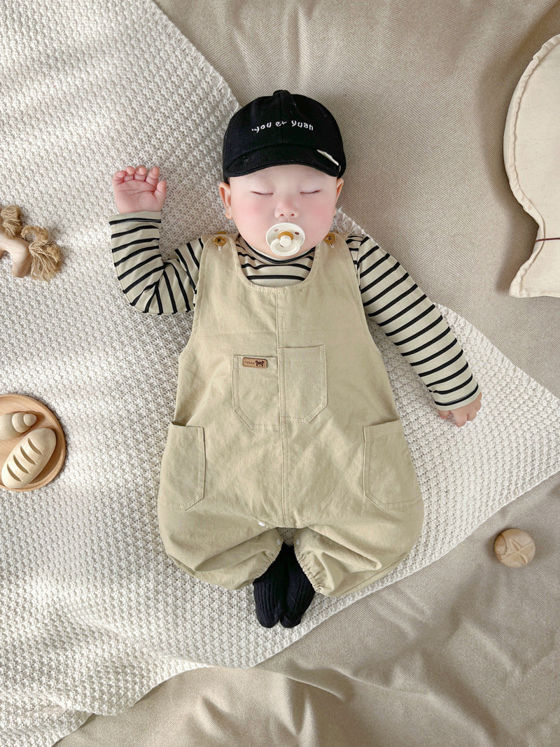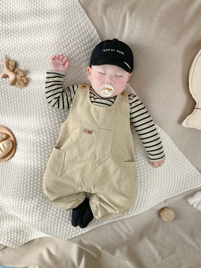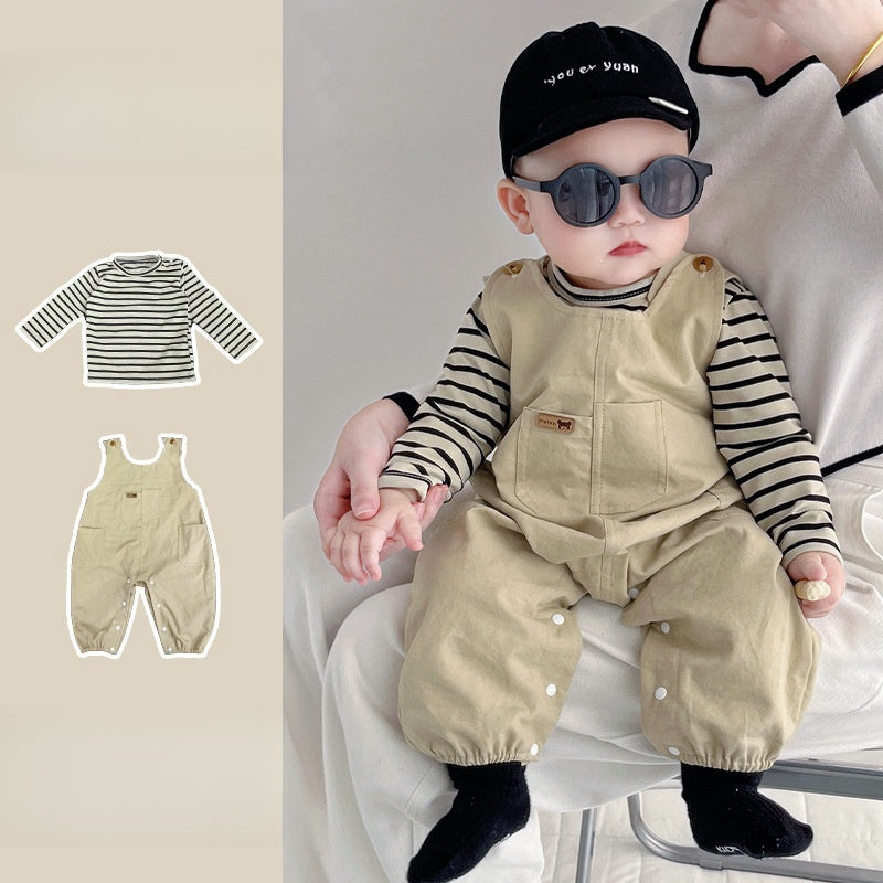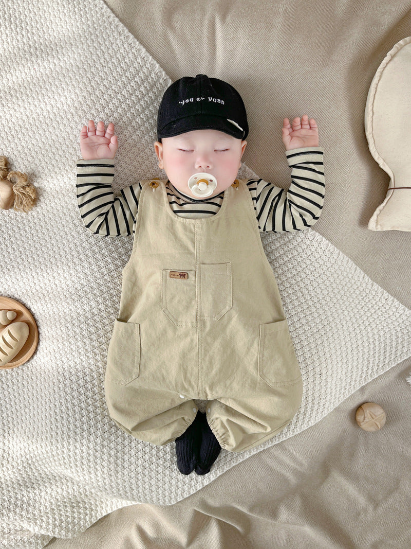 【BABY】オシャレベージュ無地サロペット&ボーダートップスSK062411
