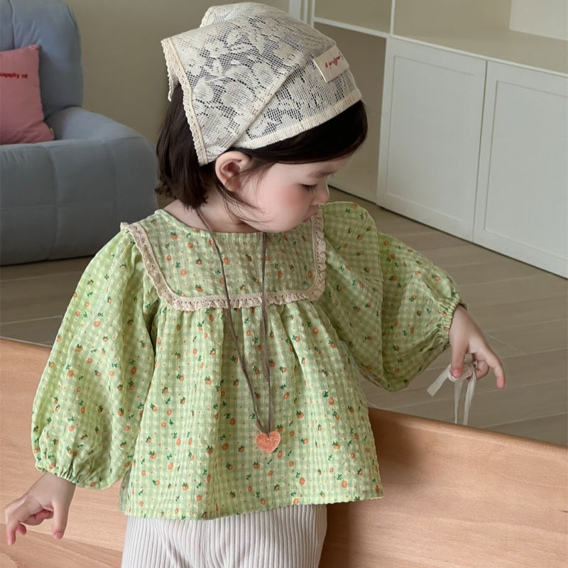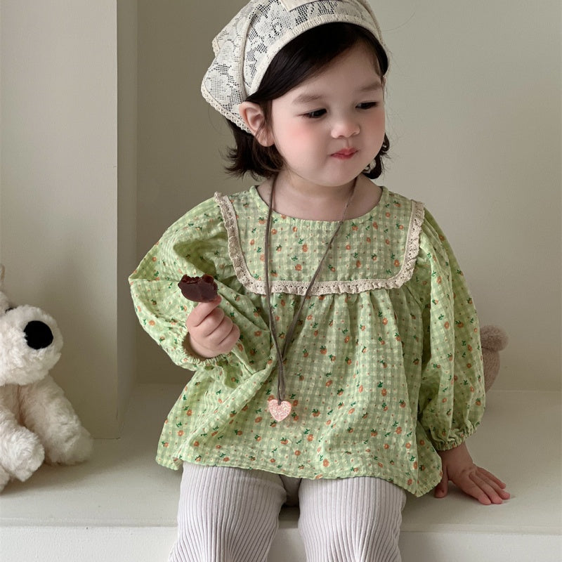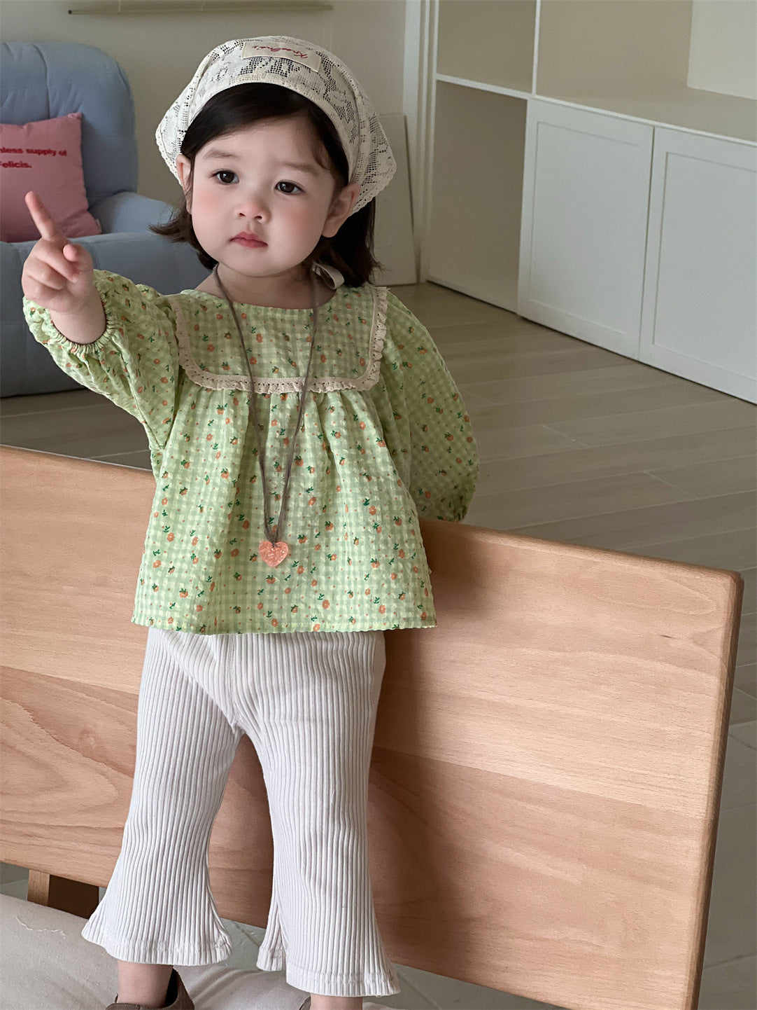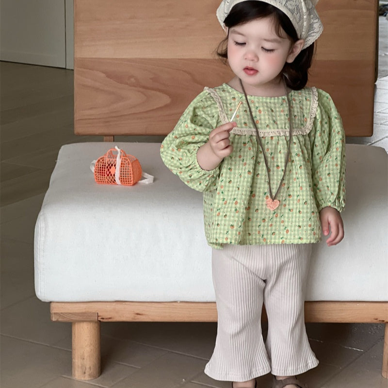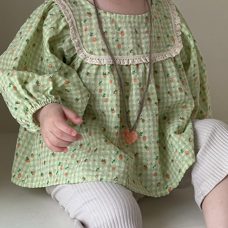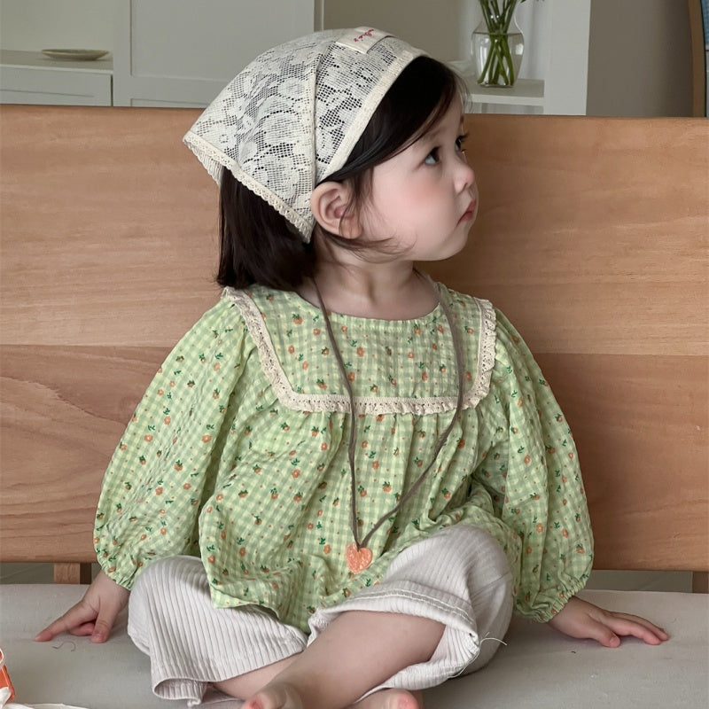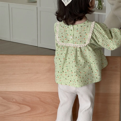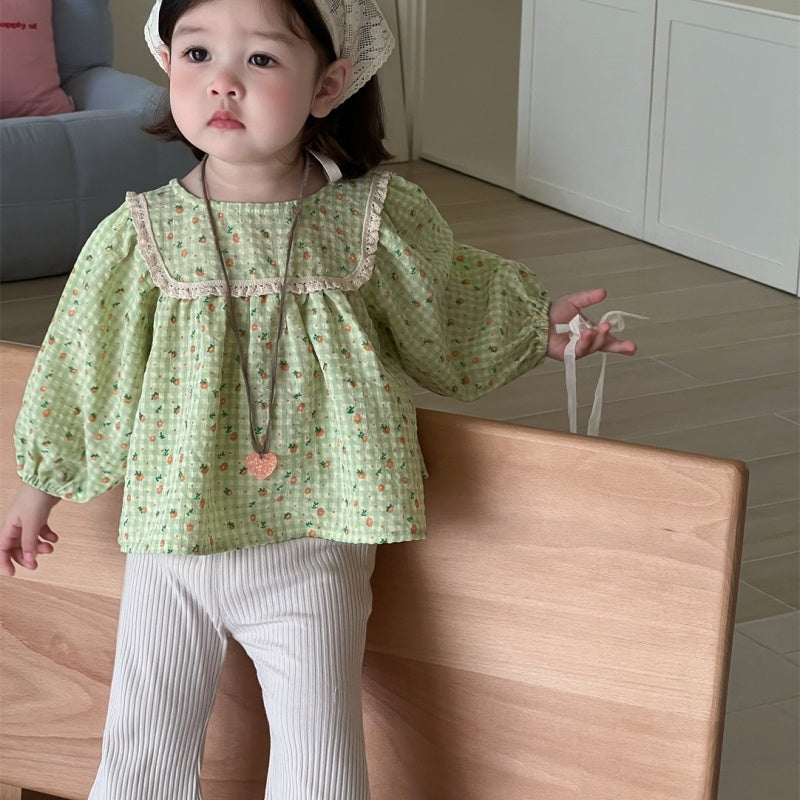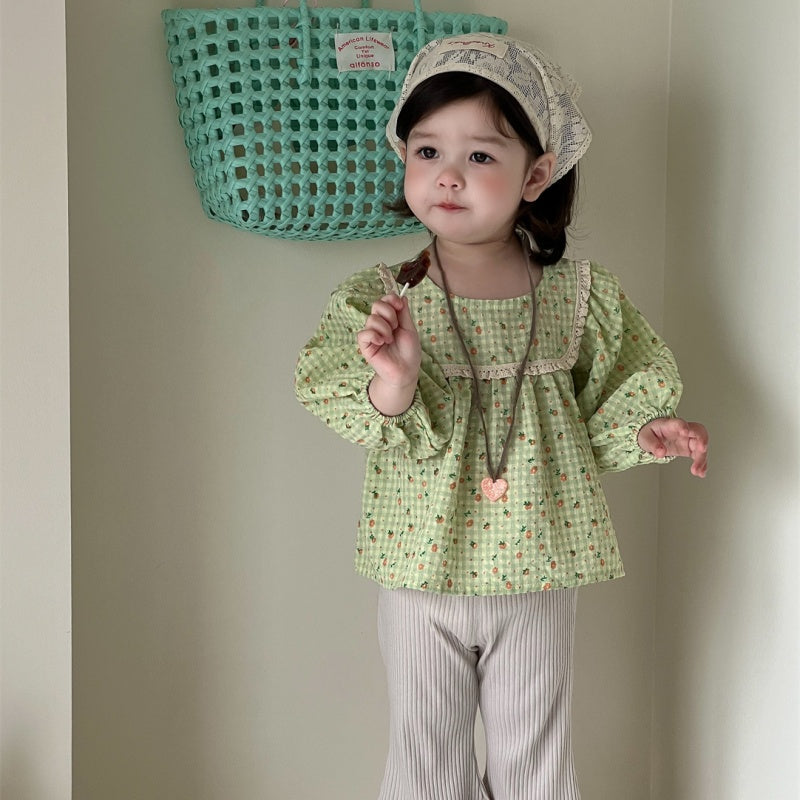 【BABY】レーススクエア襟小花柄ブラウス、リブベルボトムパンツSK100837