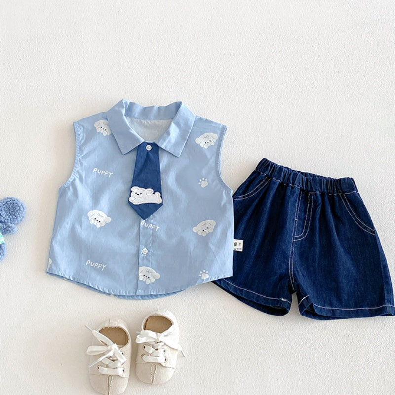 【BABY】夏新作いぬ刺繍ネクタイシャツ、デニムショートパンツSK104806