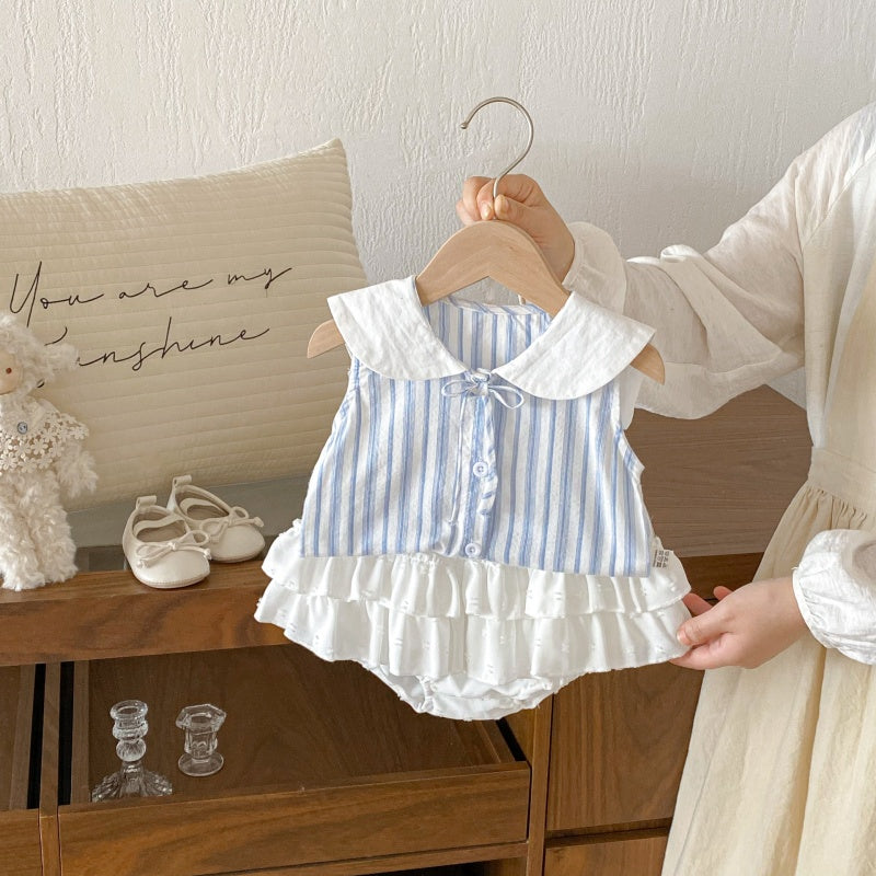 【BABY】夏新作丸襟ストライプノースリーブシャツ&フリルショートパンツSK104618