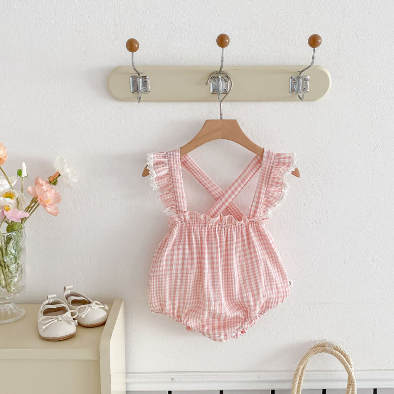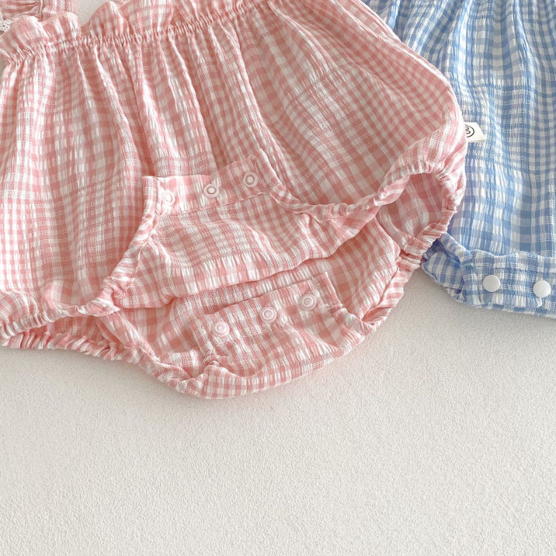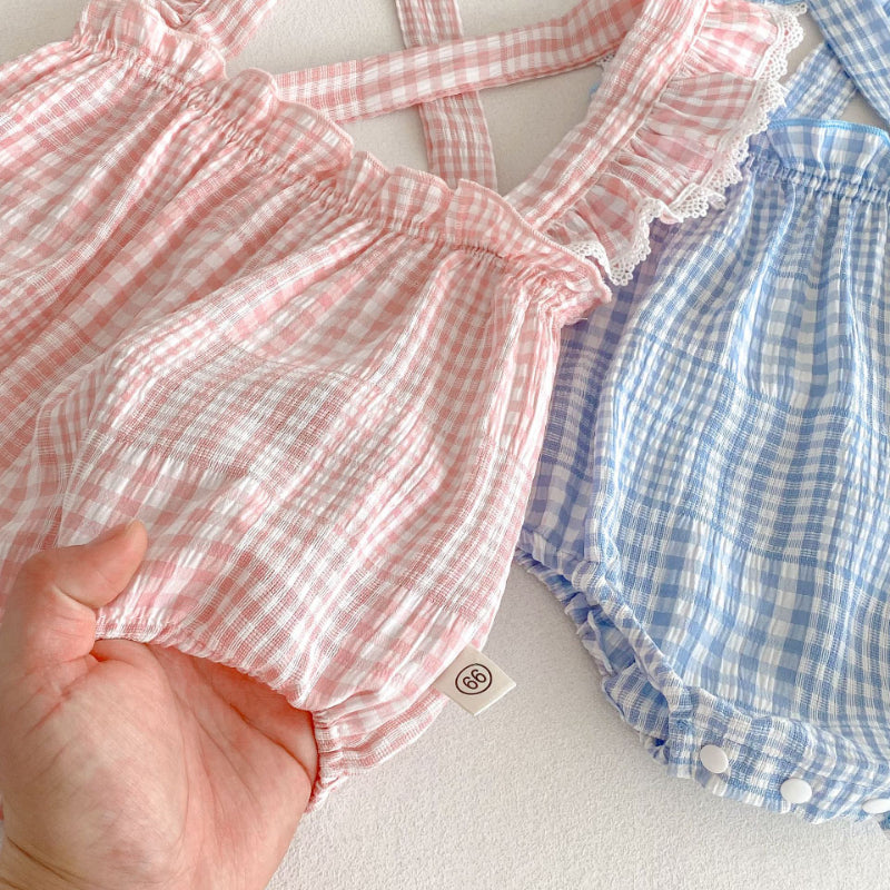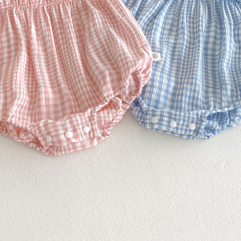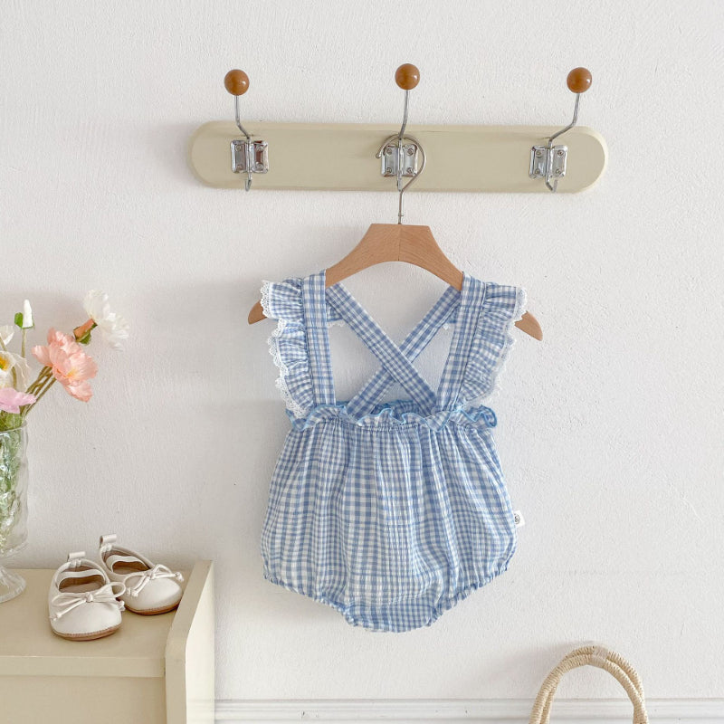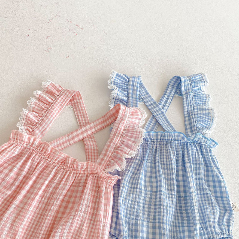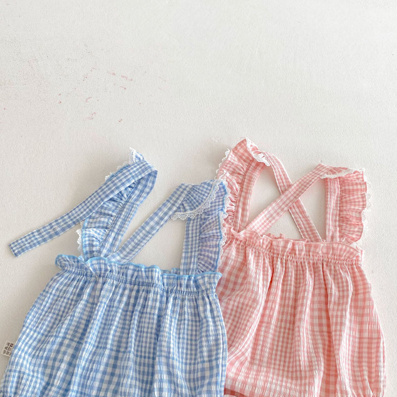 【BABY】夏新作 フリル袖チェックサロペットロンパースSK091924