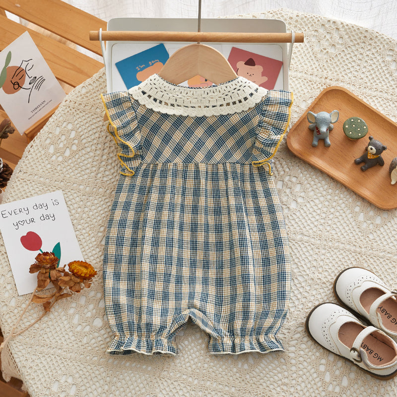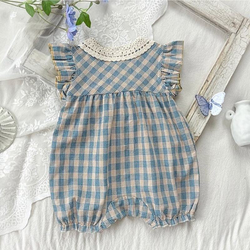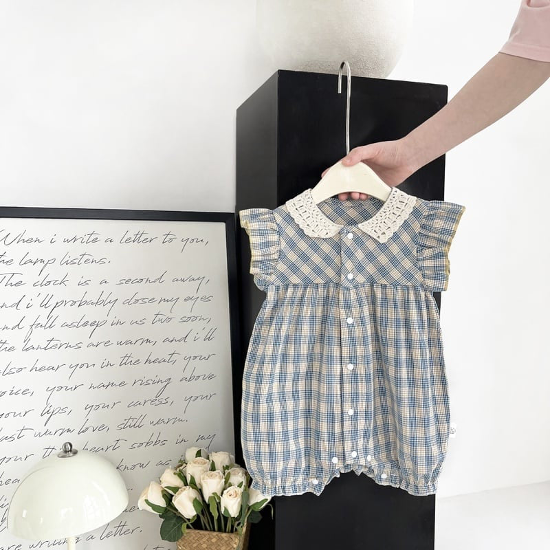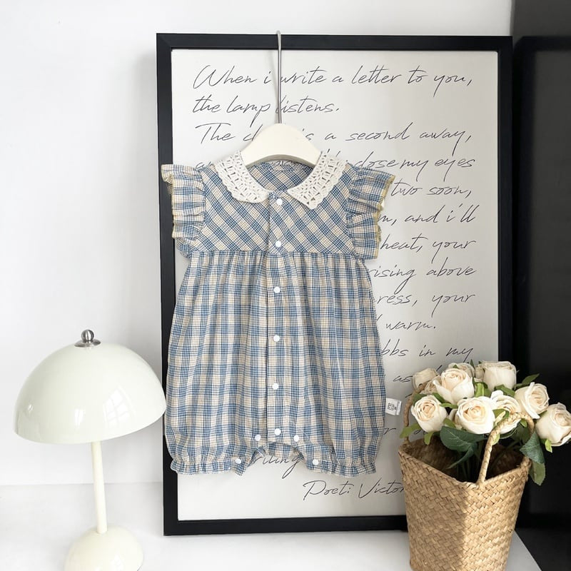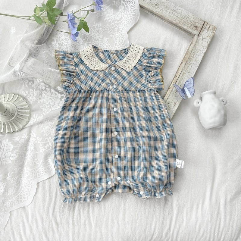 【BABY】夏新作 ブルーチェックフリル襟ロンパースSK090706