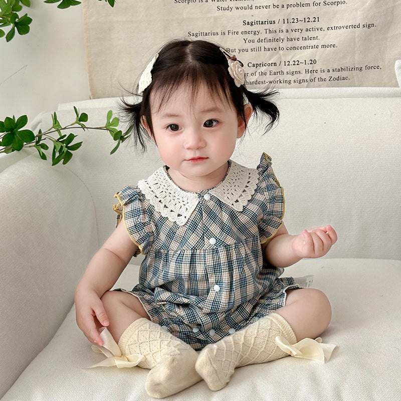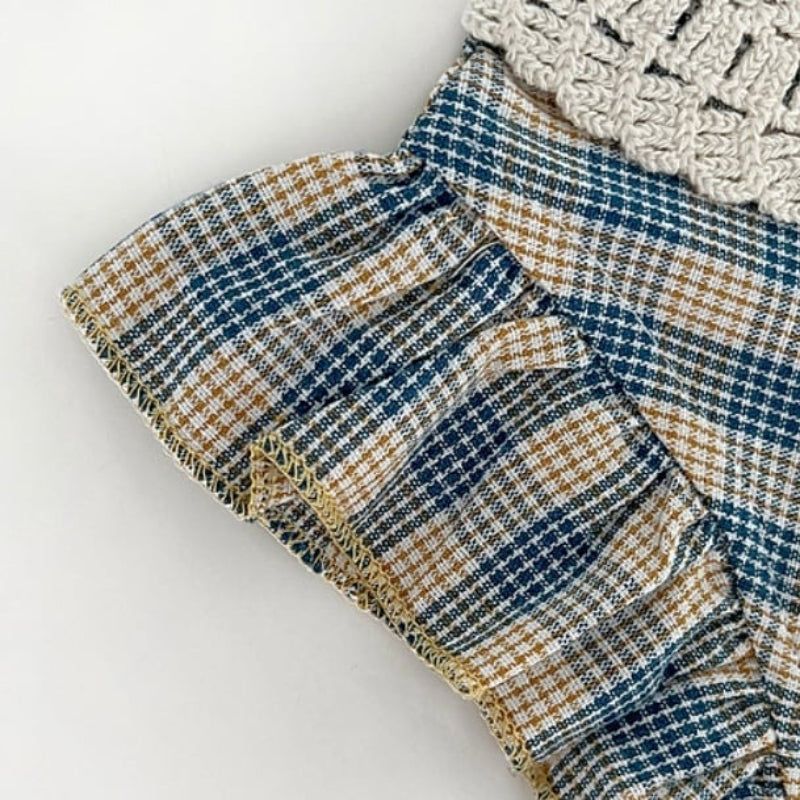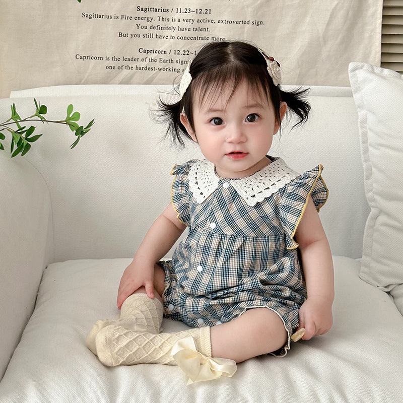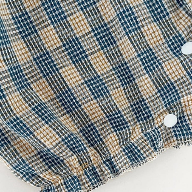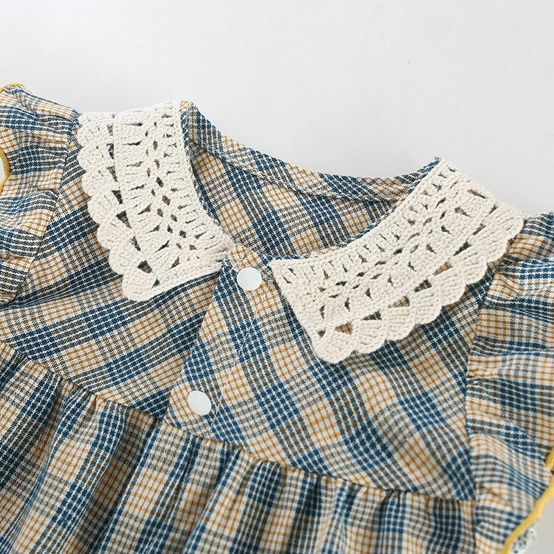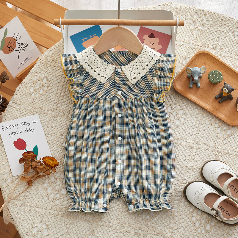 【BABY】夏新作 ブルーチェックフリル襟ロンパースSK090706