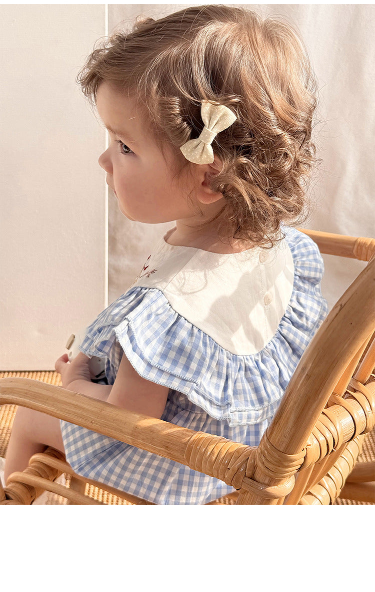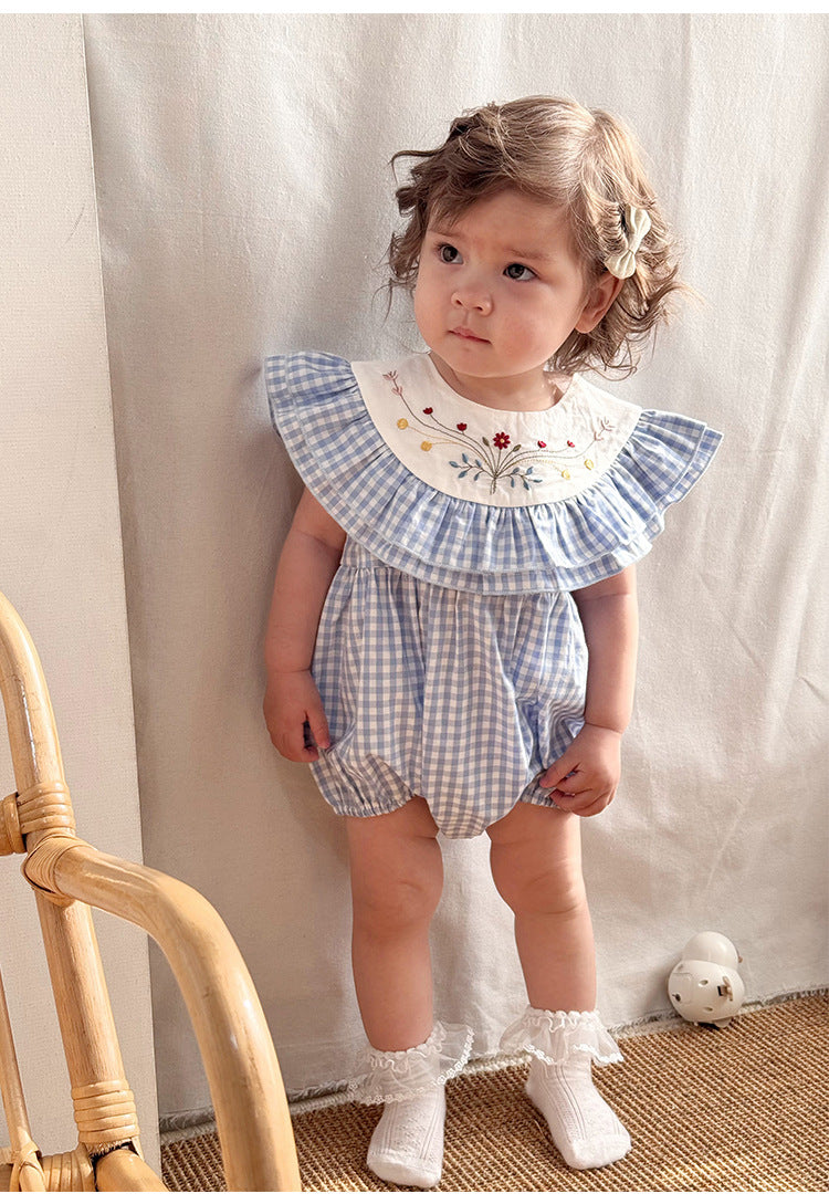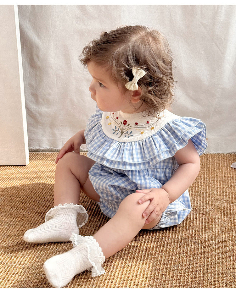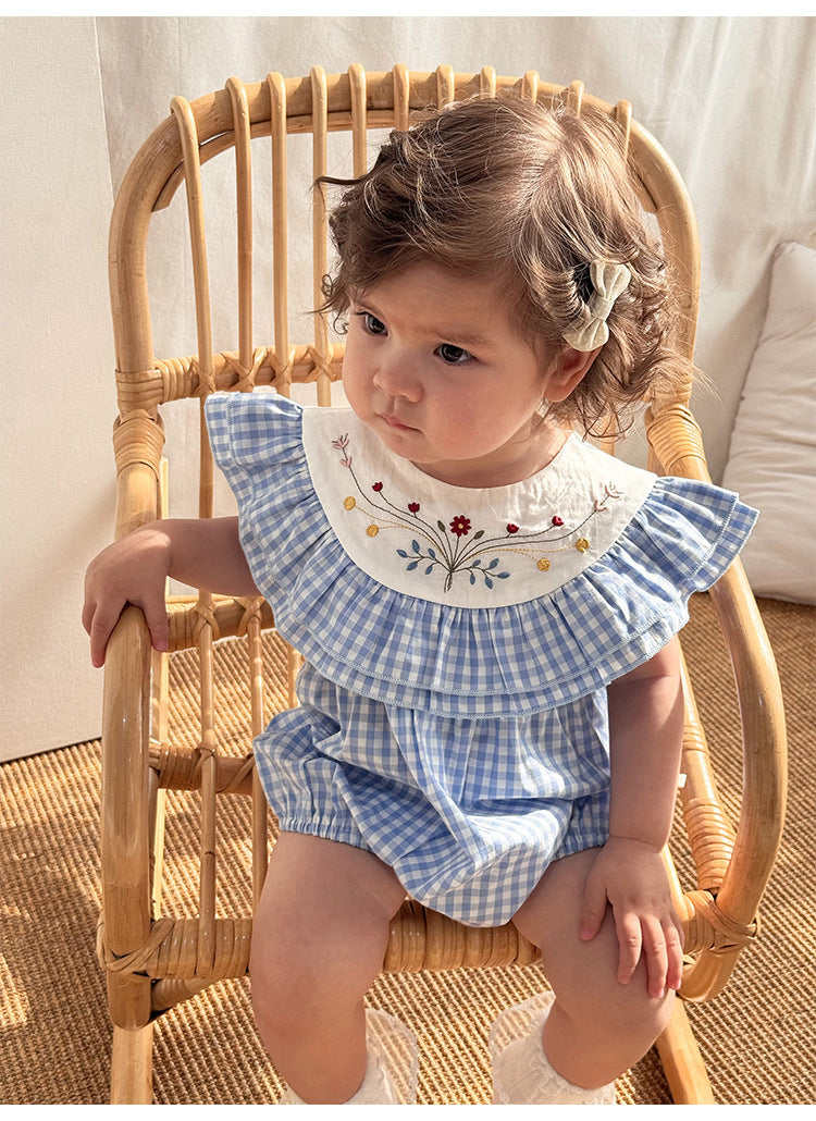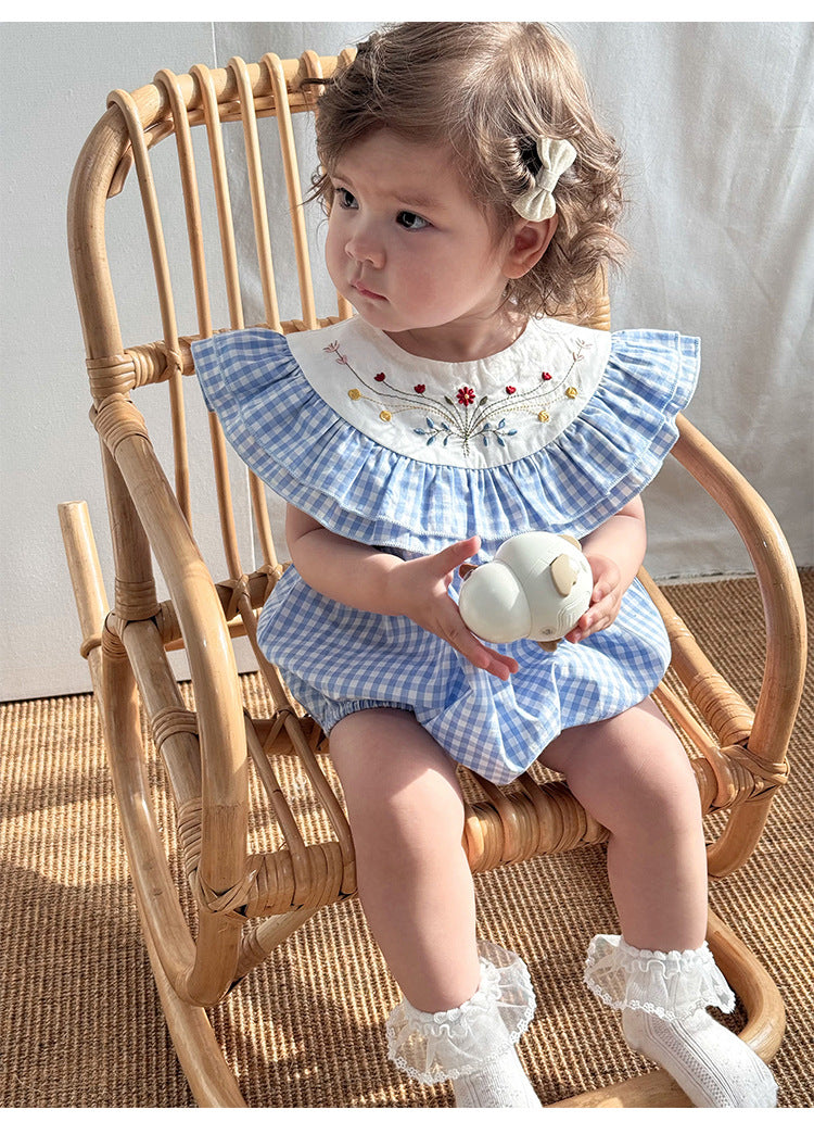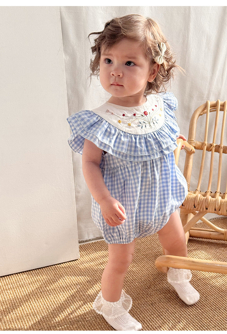【BABY】夏新作 北欧風 刺繍付きフリルチェックロンパースSK091312