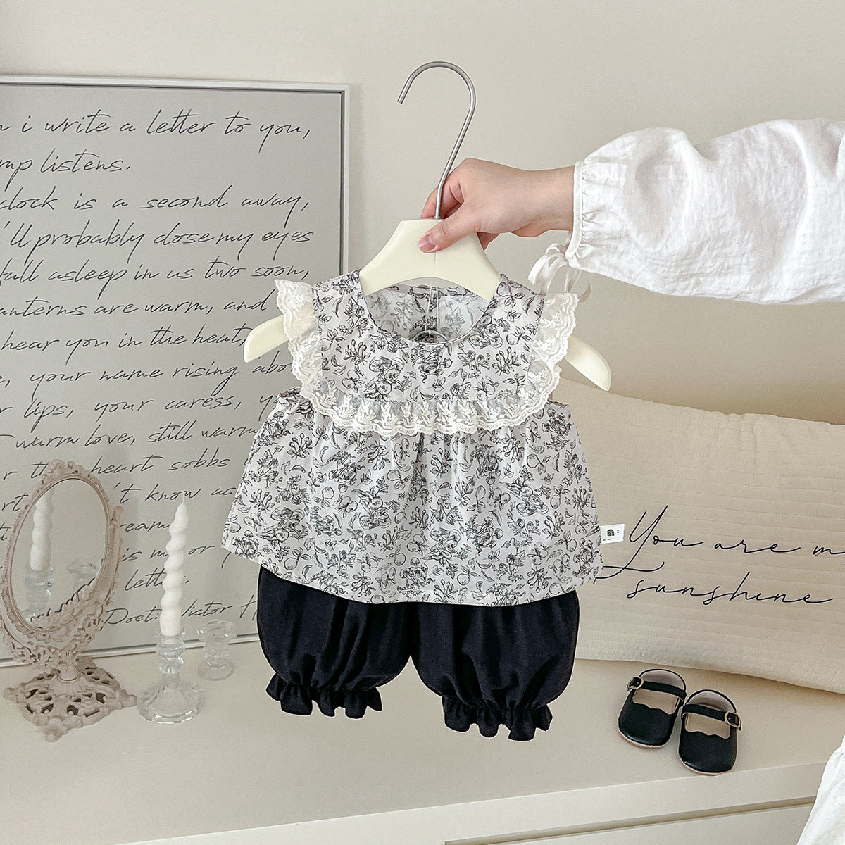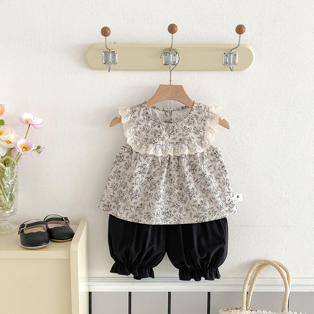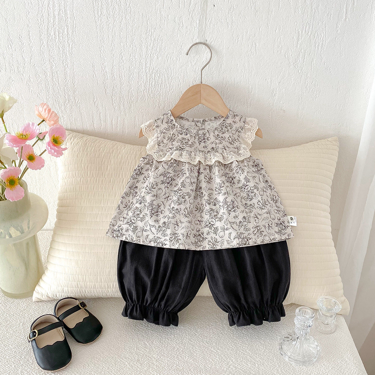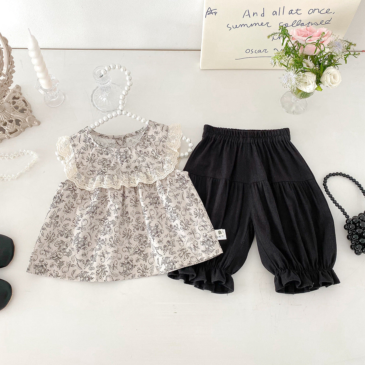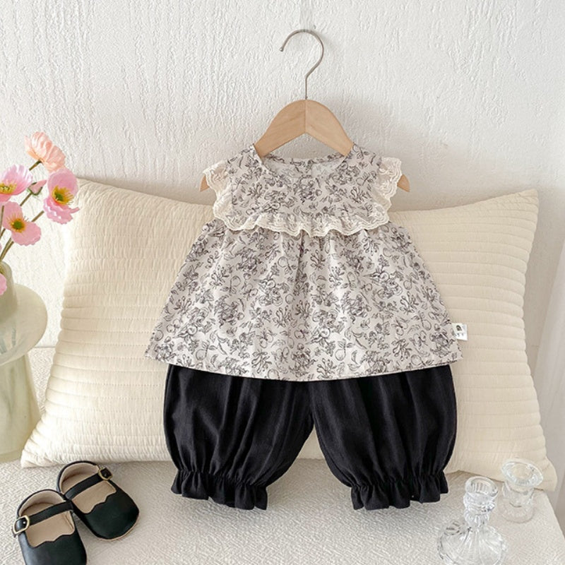 【BABY】夏新作 小花柄ブラウス、ブラックパンツSK092634