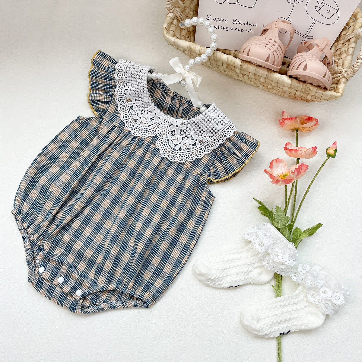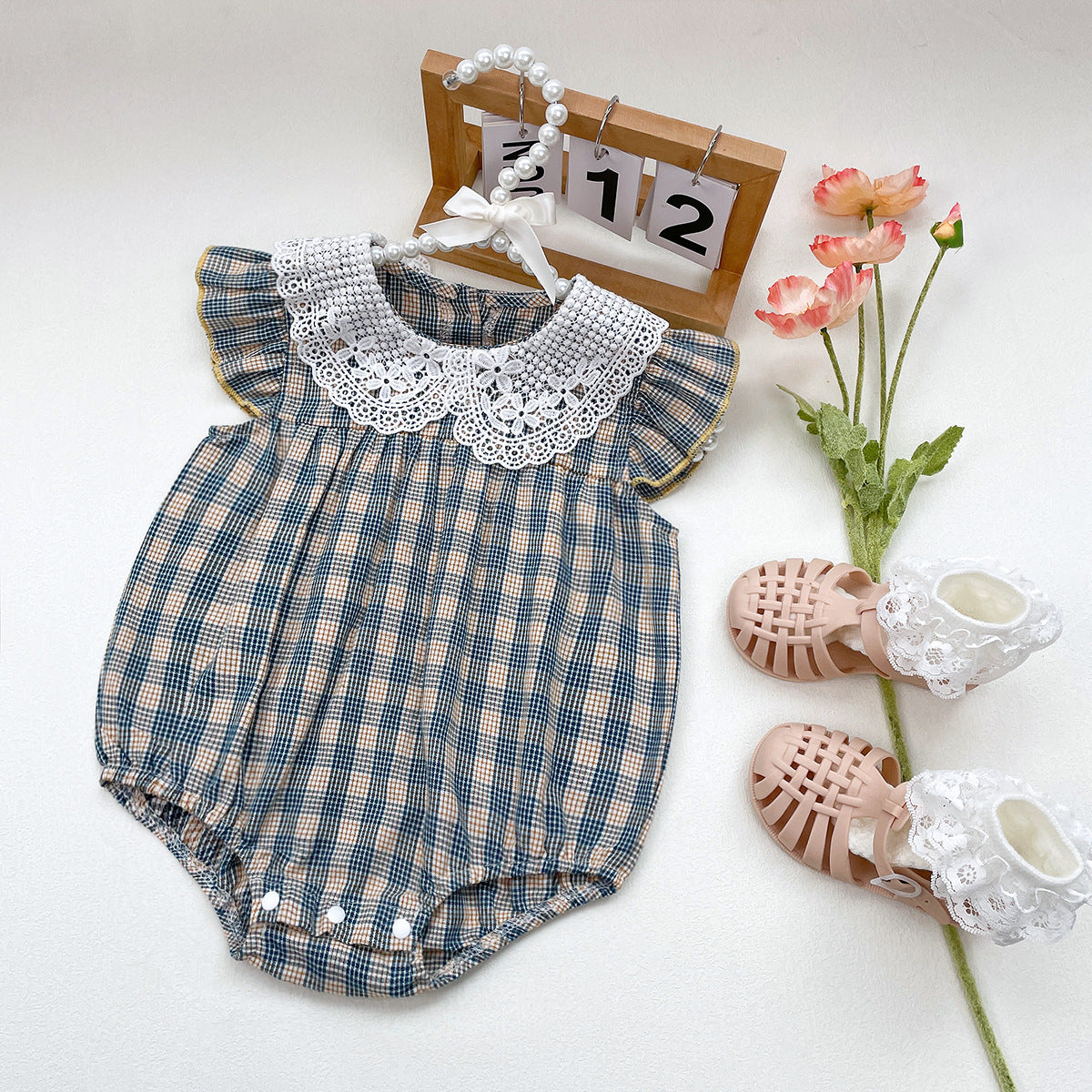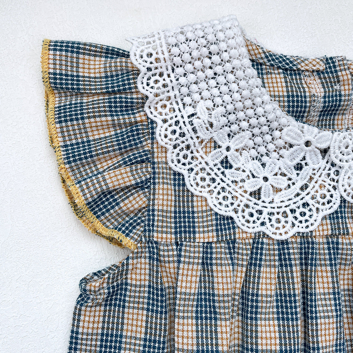 【BABY】夏新作 肩フリルレース丸襟チェックロンパースSK062726