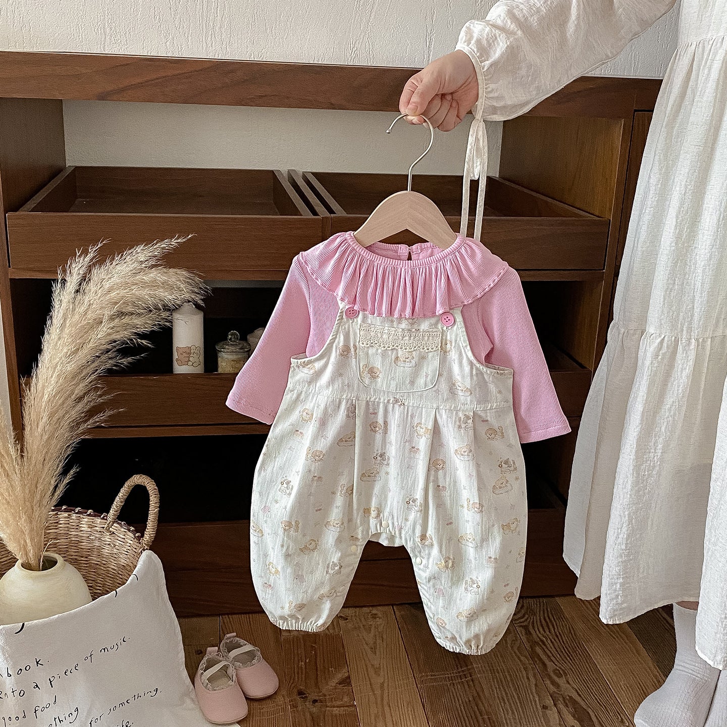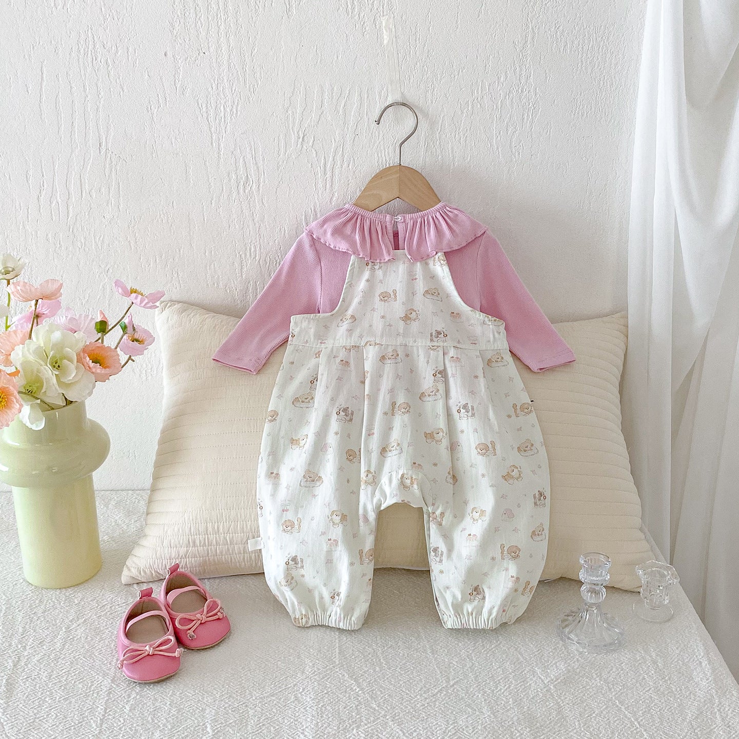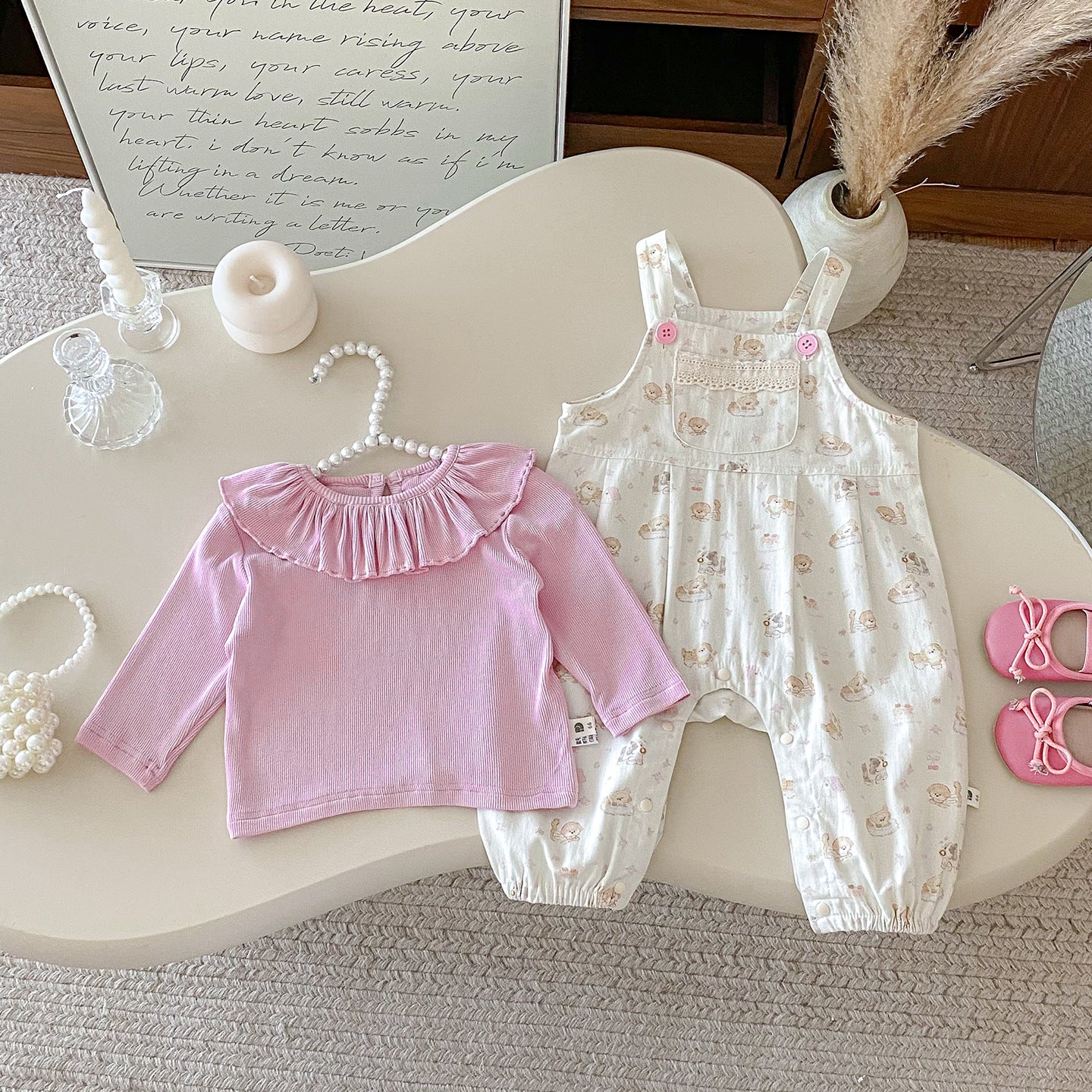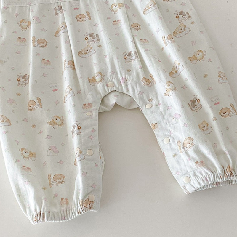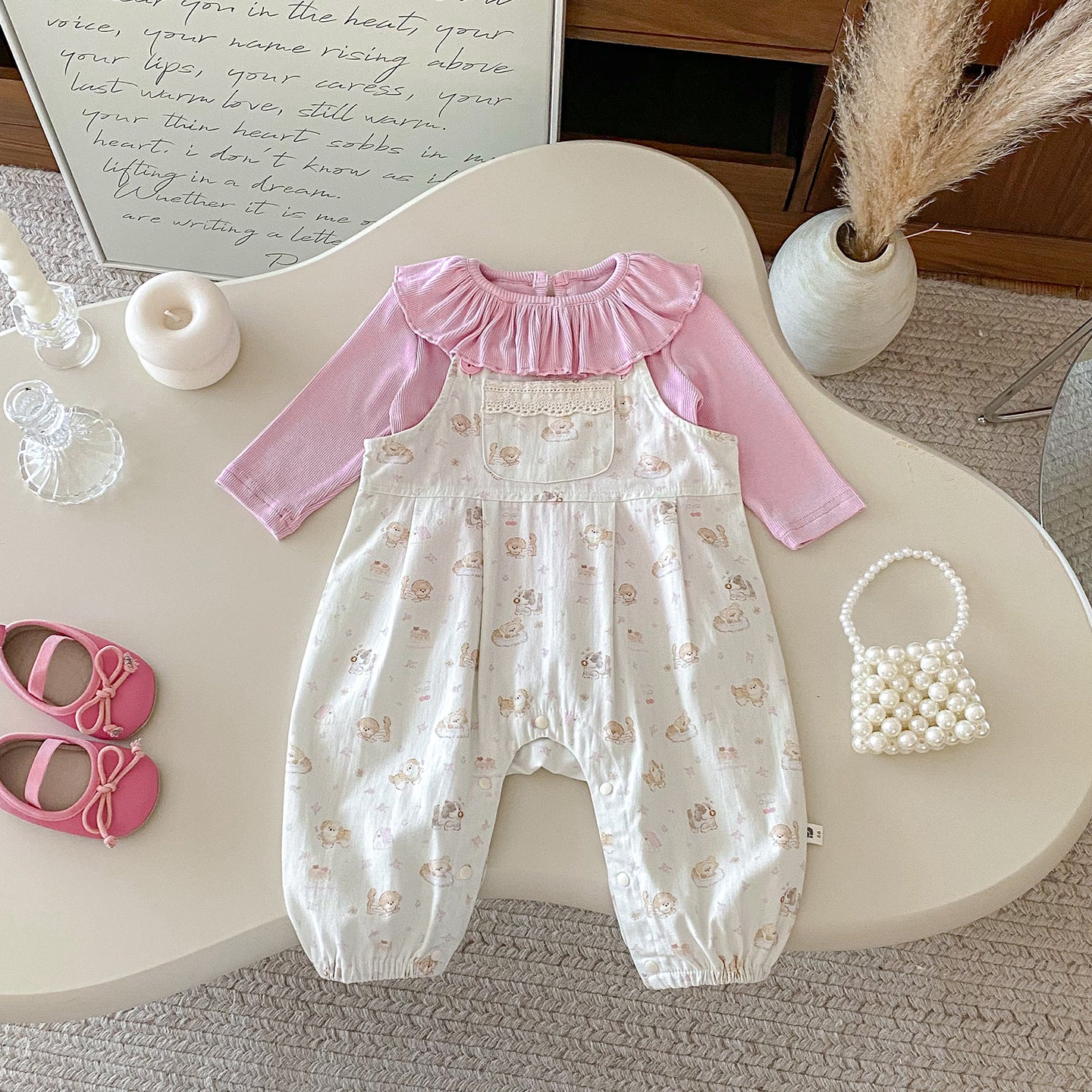 【BABY】いぬ柄サロペットパンツ&フリル襟TシャツSK100425