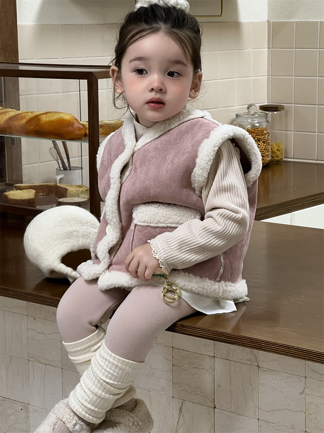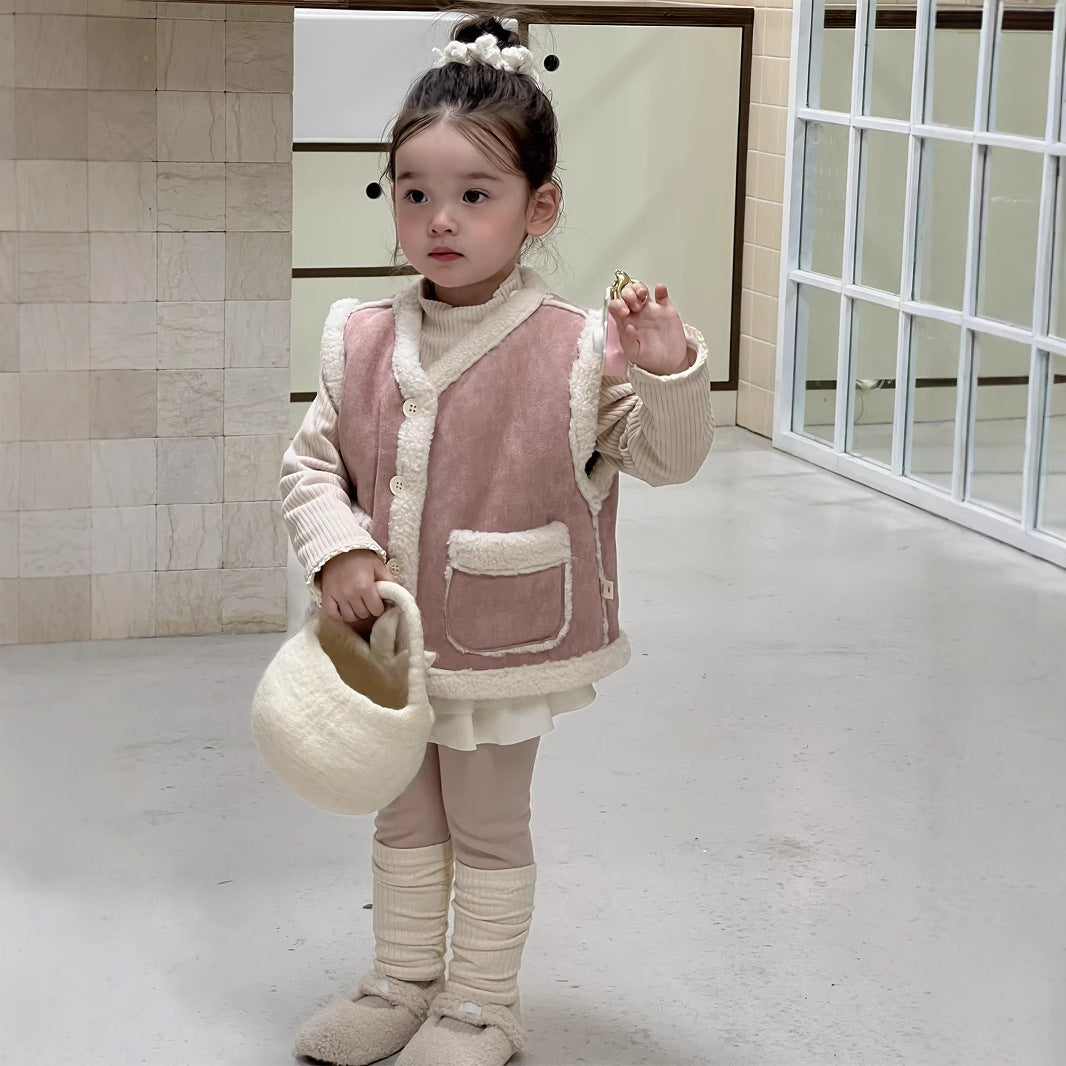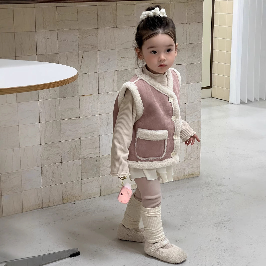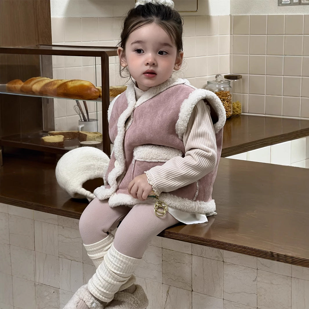 【BABY&KID】もこもこ暖かいベスト、 無地暖かいTシャツ、裏起毛レギンスSK021506