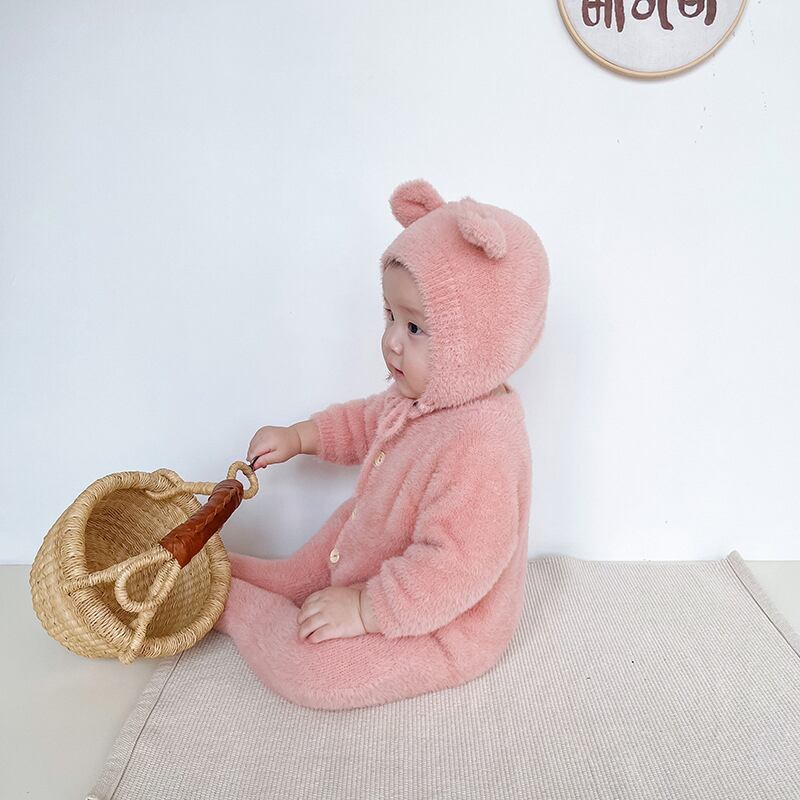 【BABY&KID】冬新作キュートピュアカラーミンクカシミアロンパース クマミミ帽子付きSK11377