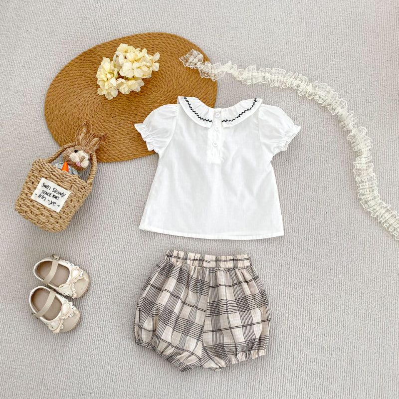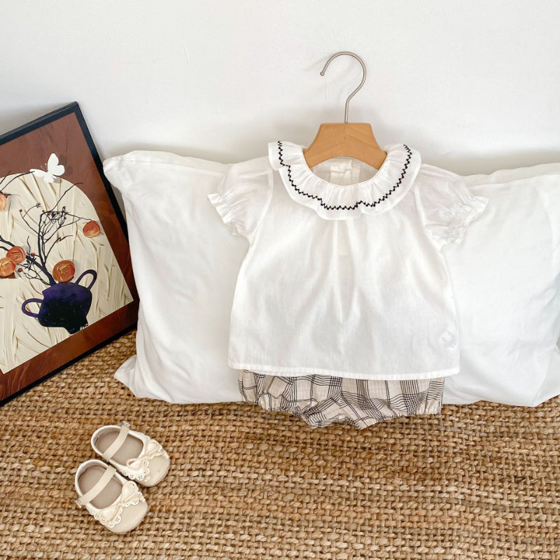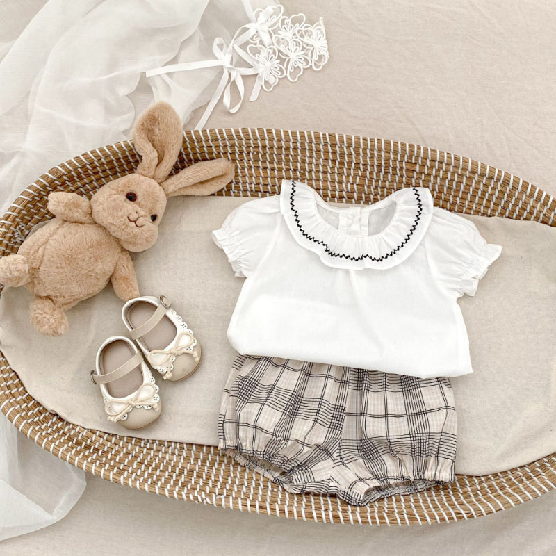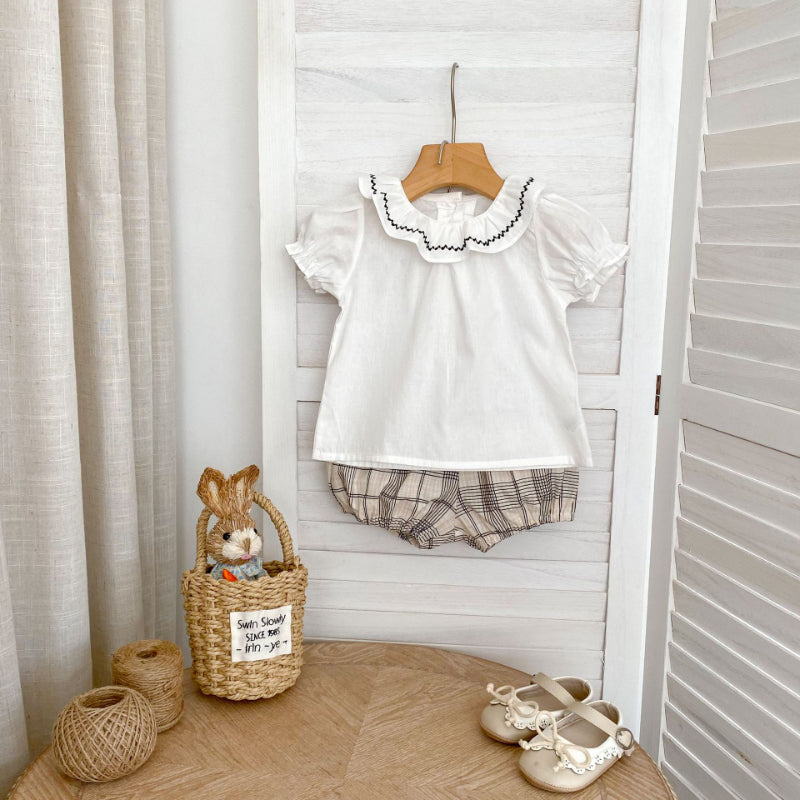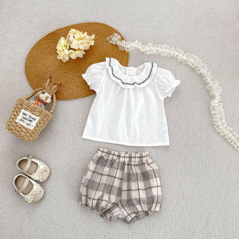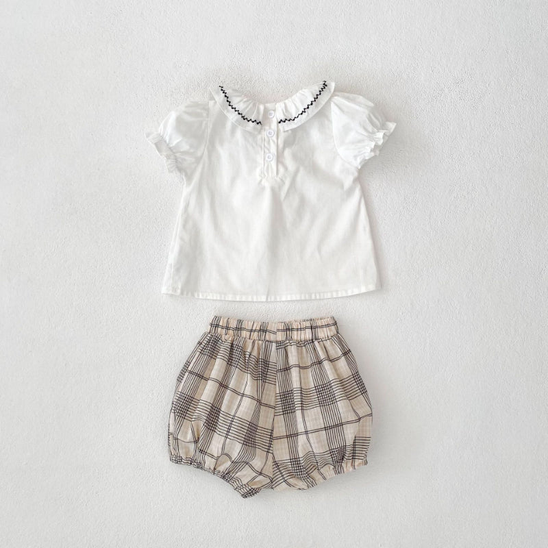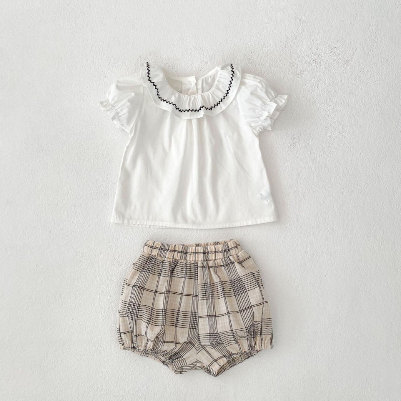 【BABY&KID】夏新作 刺繍フリル襟トップス&チェックショートパンツSK081524