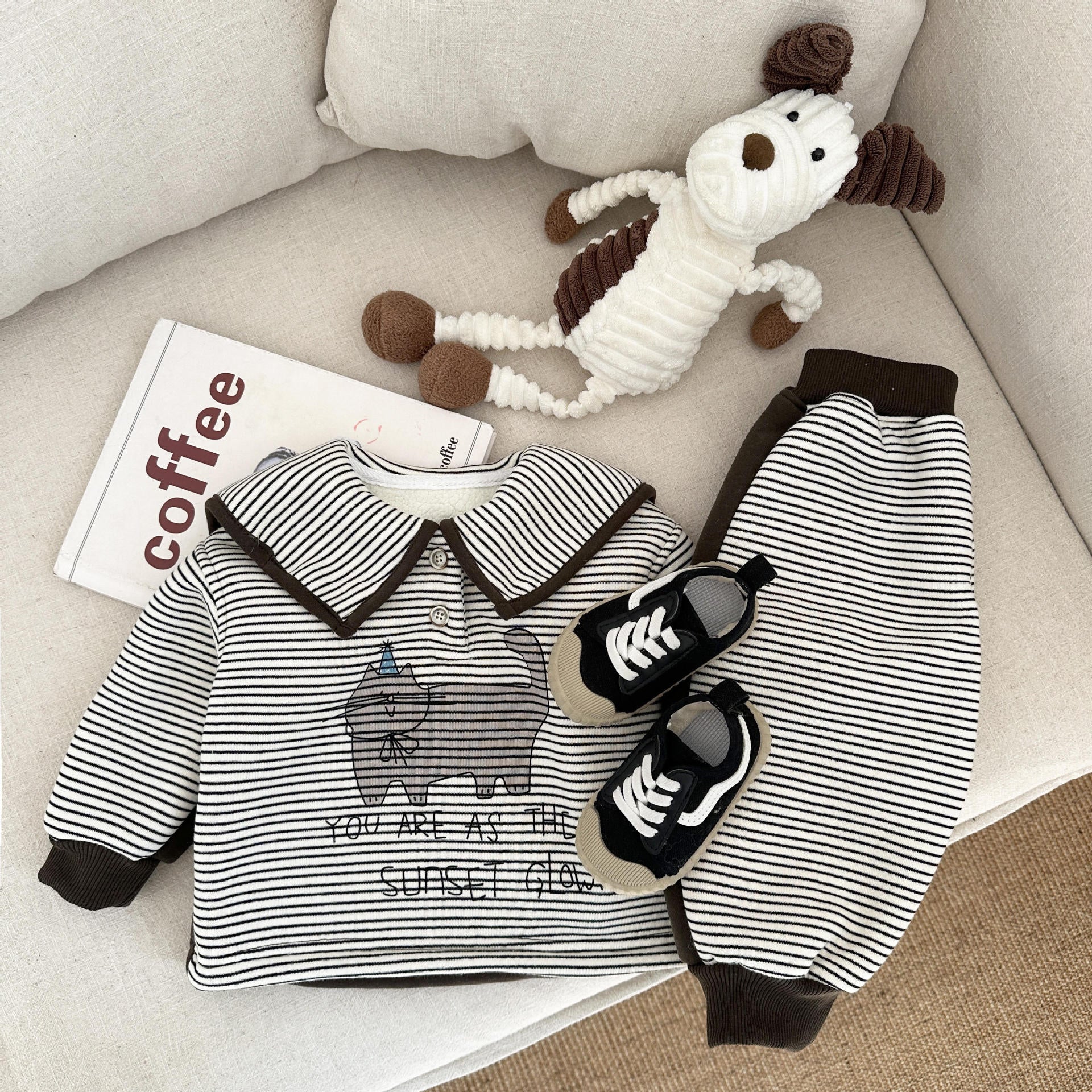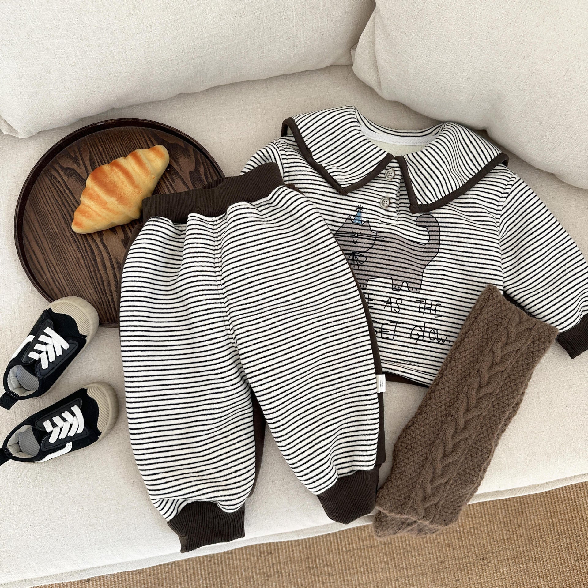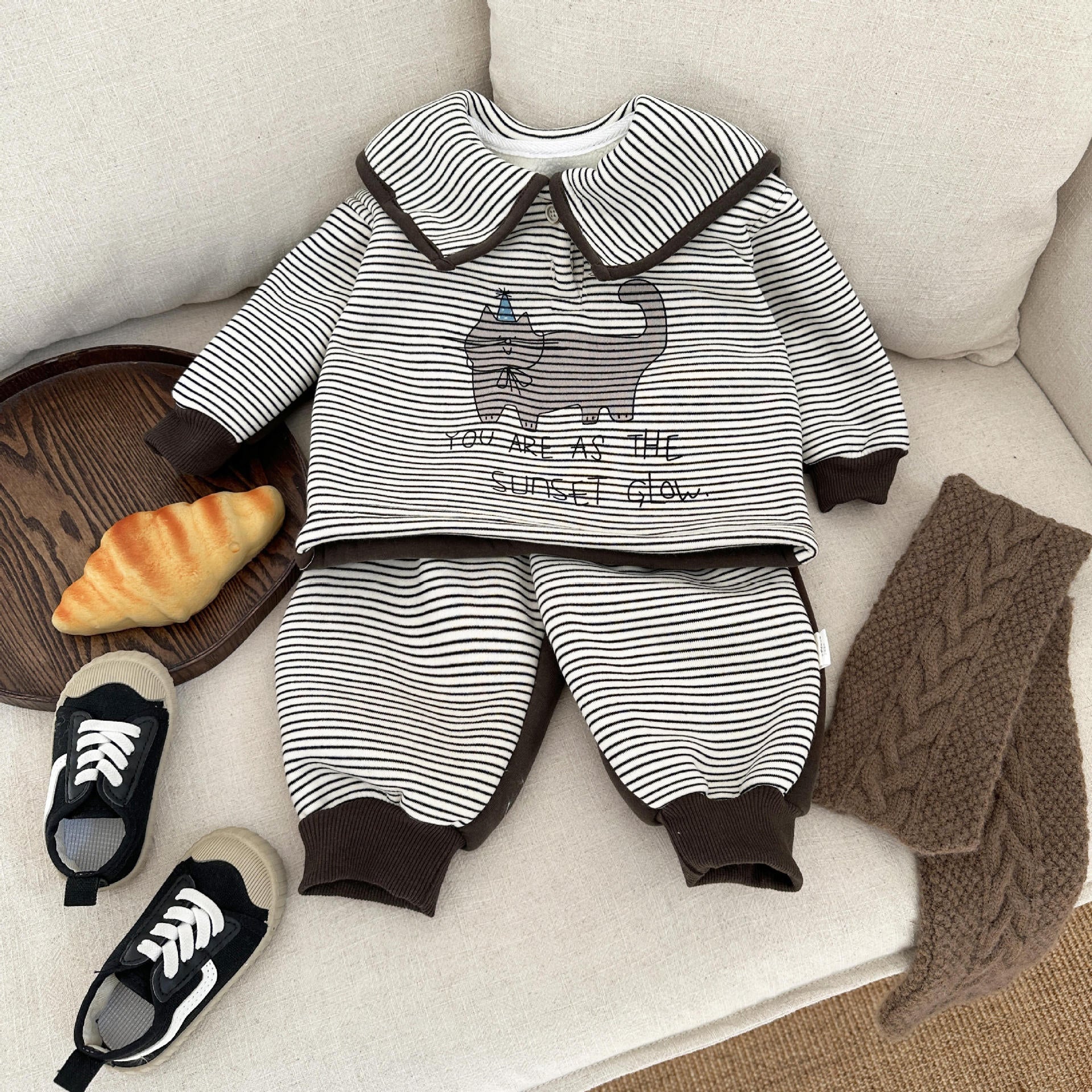 【BABY&KID】韓国風 猫柄暖かいボーダーセットアップSK022410