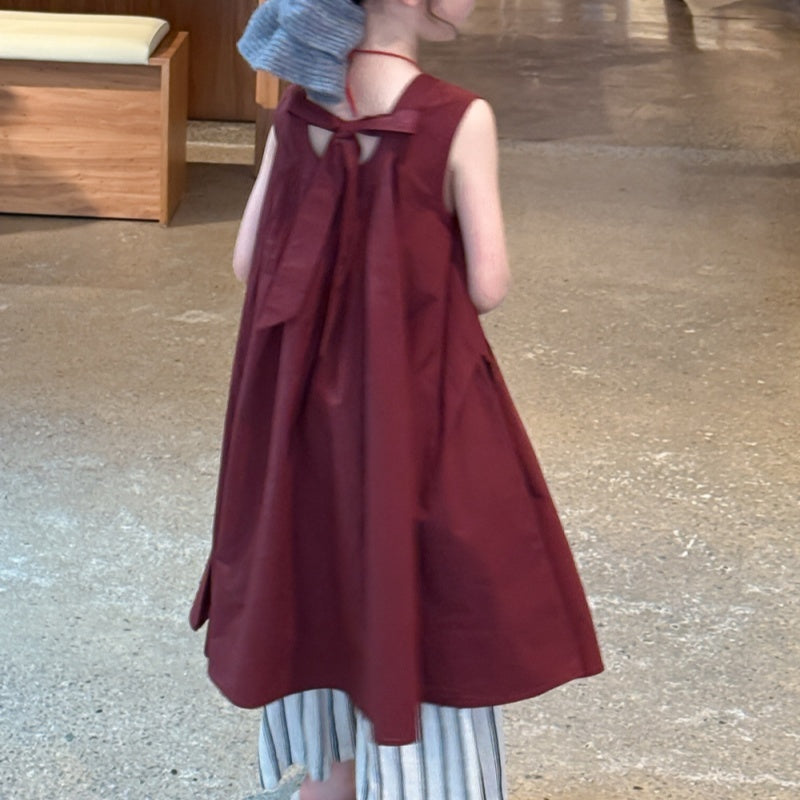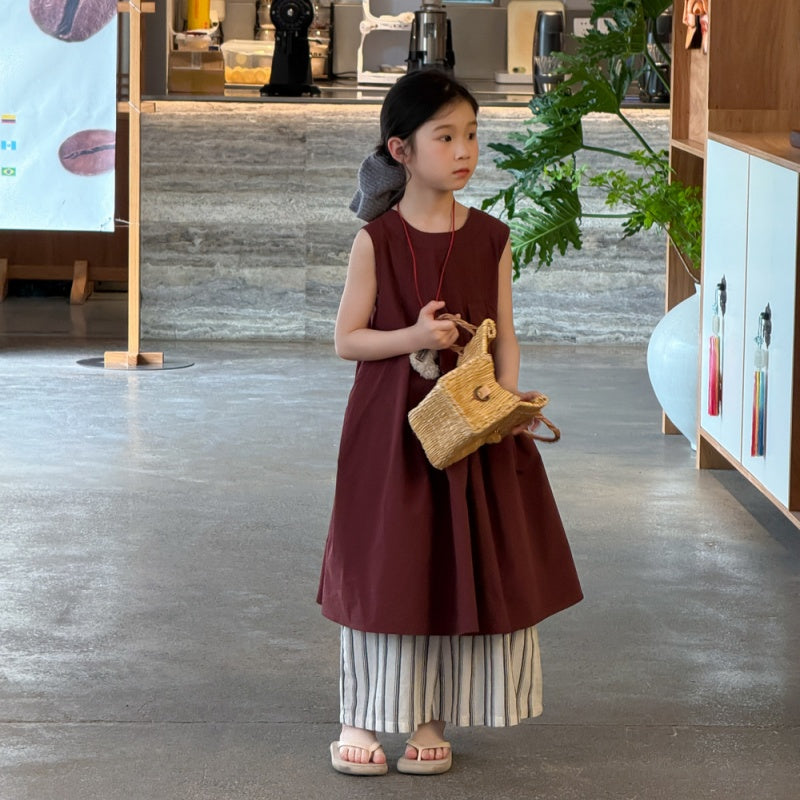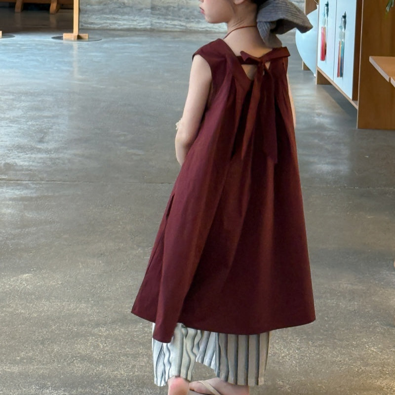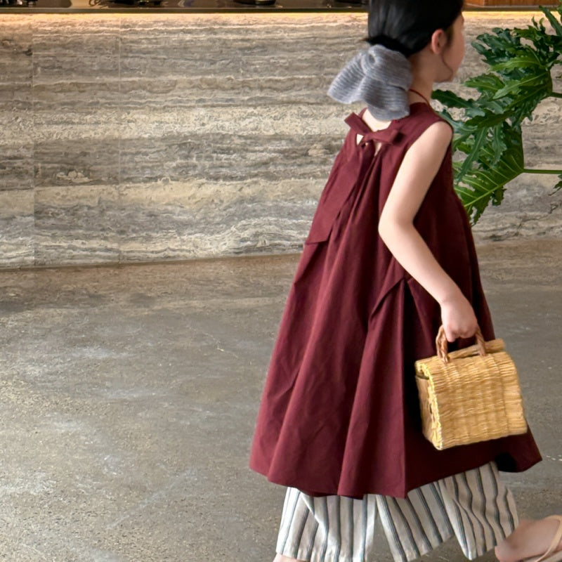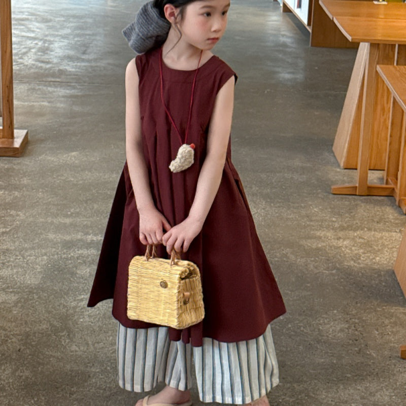 【BABY&KID】夏新作 無地リボンノースリーブワンピース、ボーダーパンツSK080518